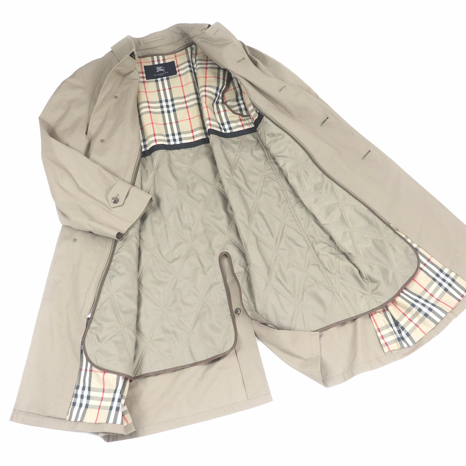 Pre-owned BURBERRY LONDON men's Nova check quilted liner trench coat, beige, item number 94-175-6. Made in Japan with hanger. Authentic.