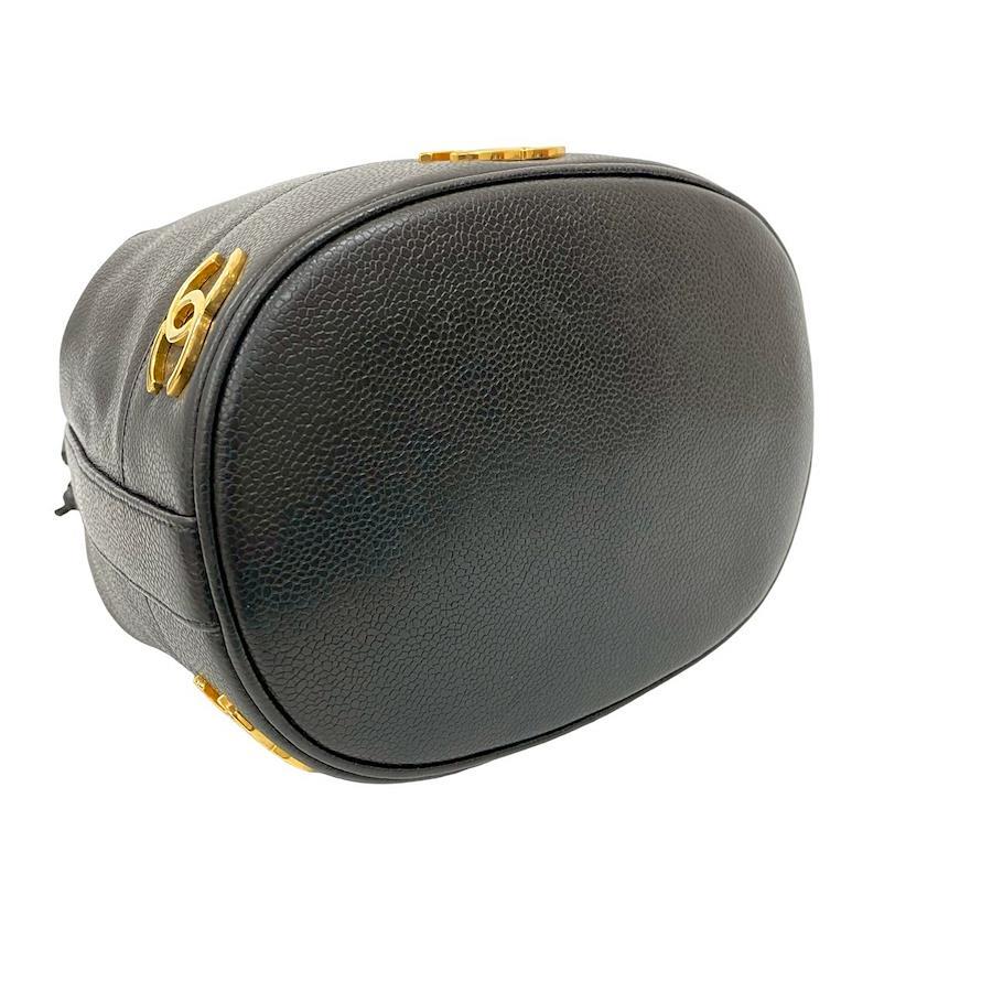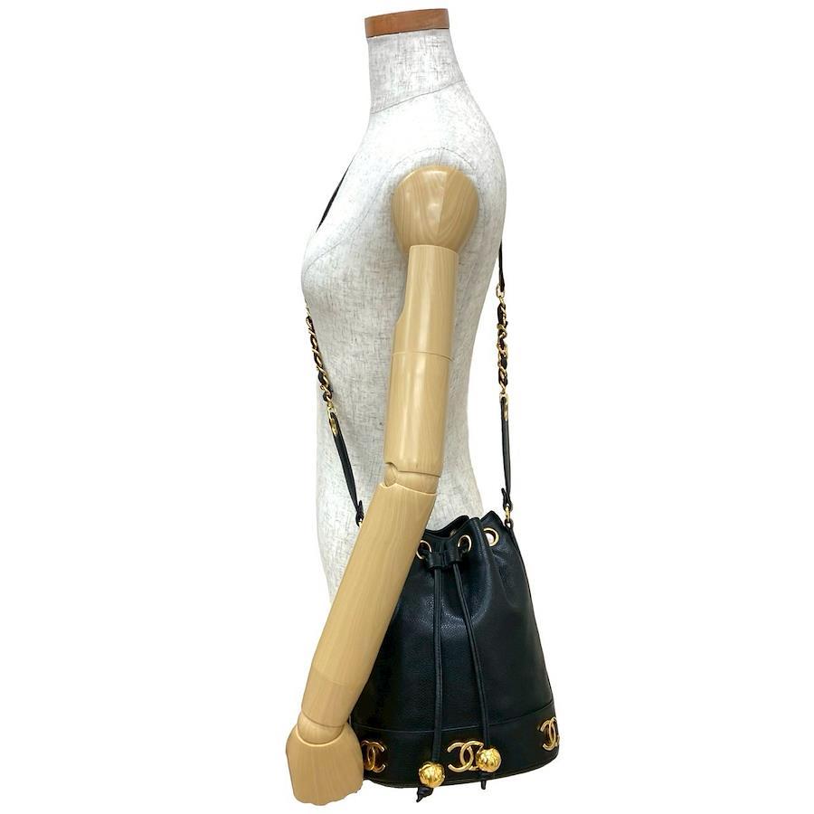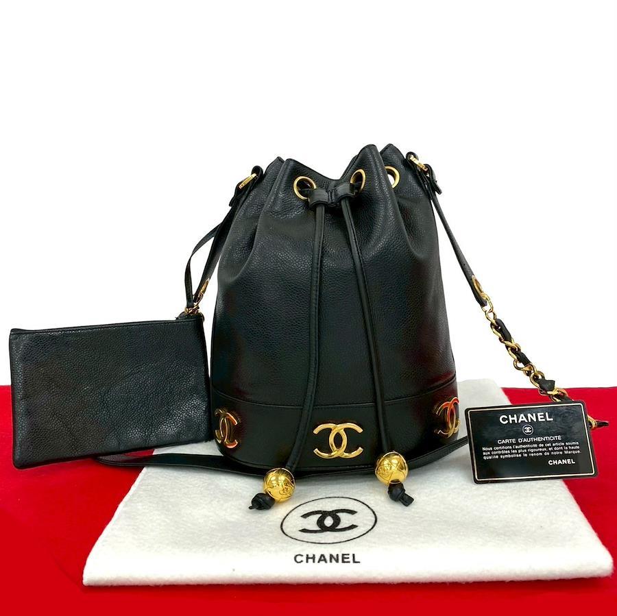 CHANEL Triple Coco Caviar Skin Chain Drawstring Shoulder Bag, Black, 424-2, with pouch, card, and sticker.