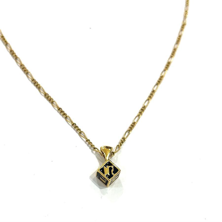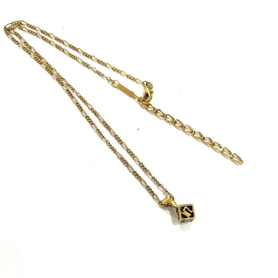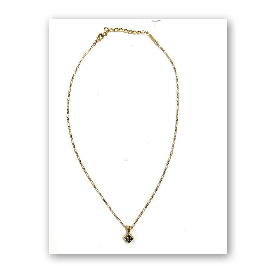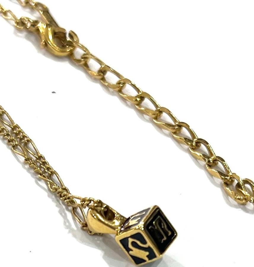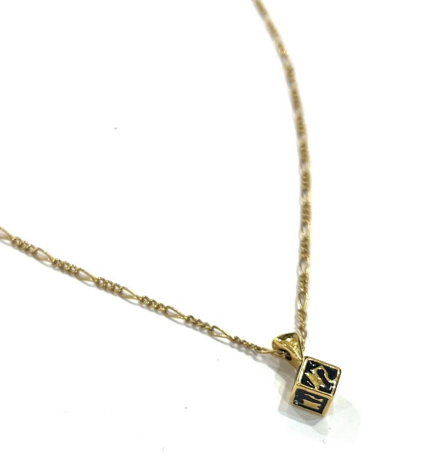 立体的なキューブデザインにブランドロゴがあしらわれ、シンプルながら存在感のあるアクセントに。チェーンは繊細な輝きを放つデザインで、デコルテを華やかに演出します。ヴィンテージならではのクラシカルな雰囲気が漂う、コレクションにもおすすめの逸品です。