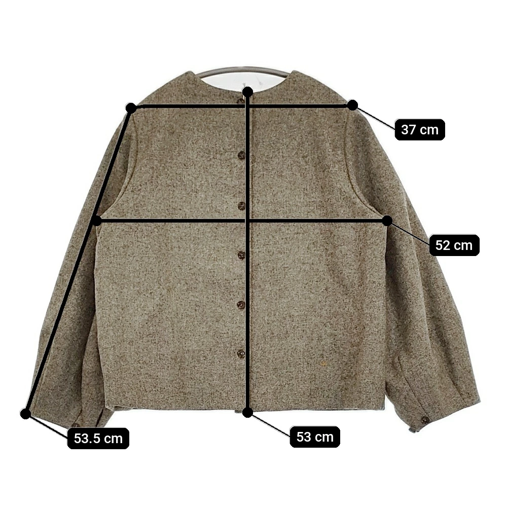 | 実寸サイズ | 肩幅:約37cm 着丈:約53cm 身幅:約52cm 袖丈:約53.5cm ※採寸画像がある商品はハンガーに吊るした状態での計測のため、平置きでの採寸とは差が生じる場合がございます。平置きでの実寸サイズをご希望の場合は、ご購入前に必ずご質問ください。 ※記載以外のサイズが合わないことを理由とした返品はできませんので、 記載部分以外で実寸サイズの気になる箇所があれば必ず購入前にご質問ください。 |