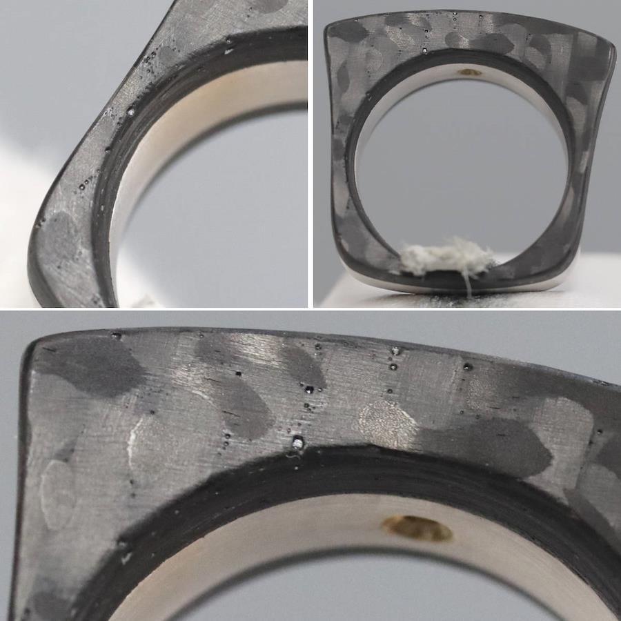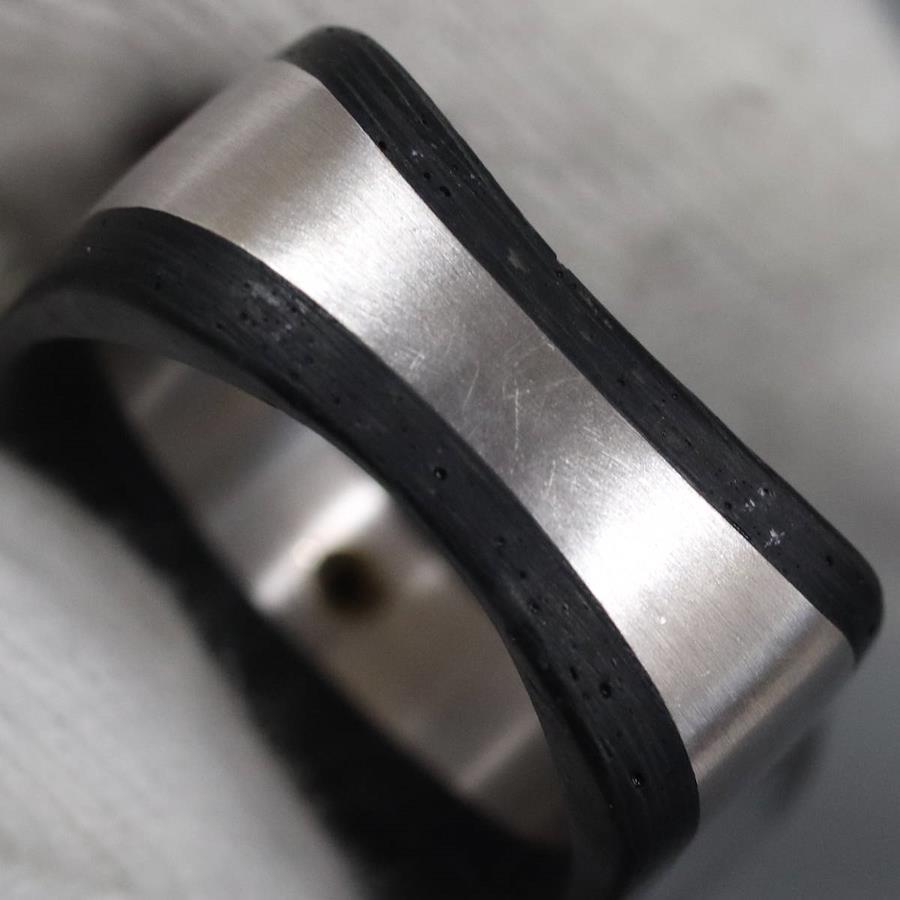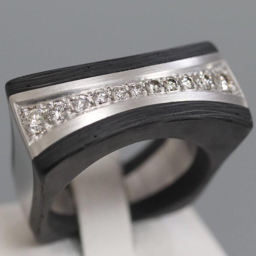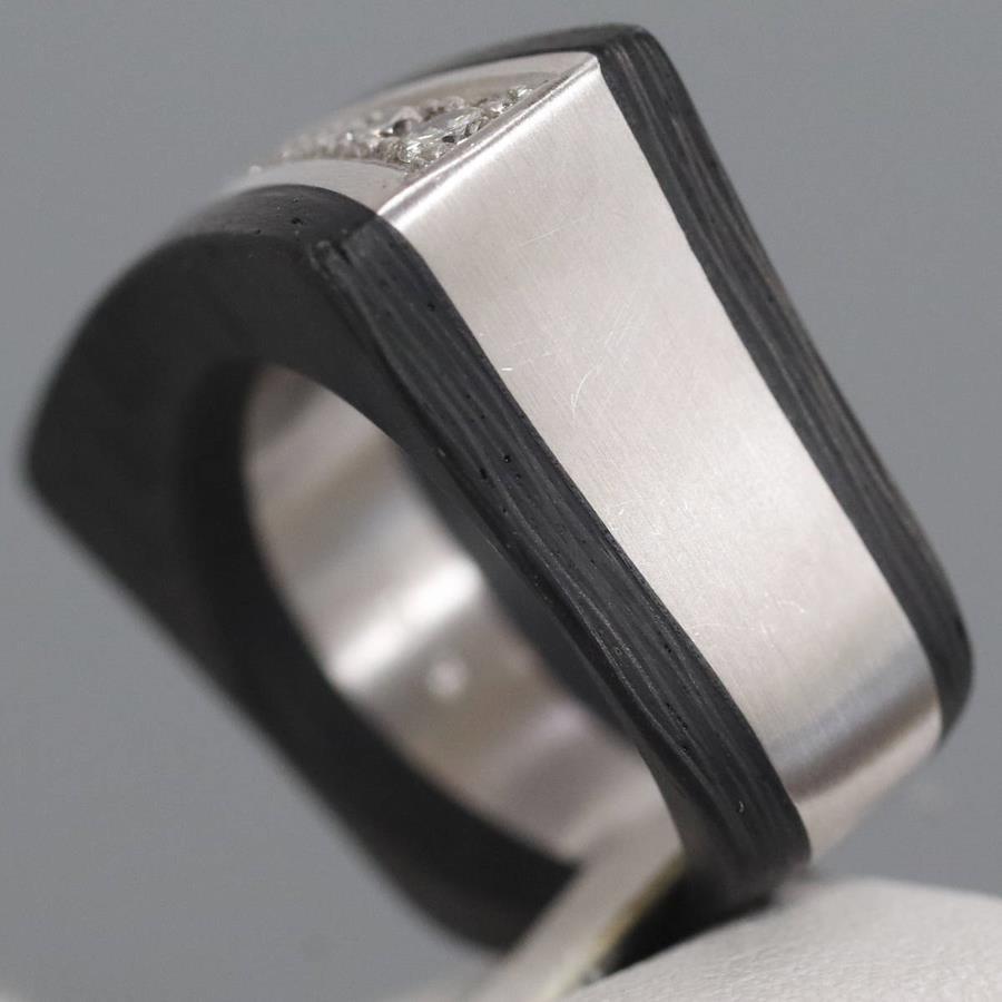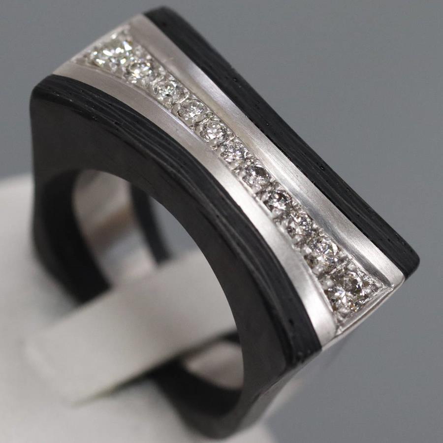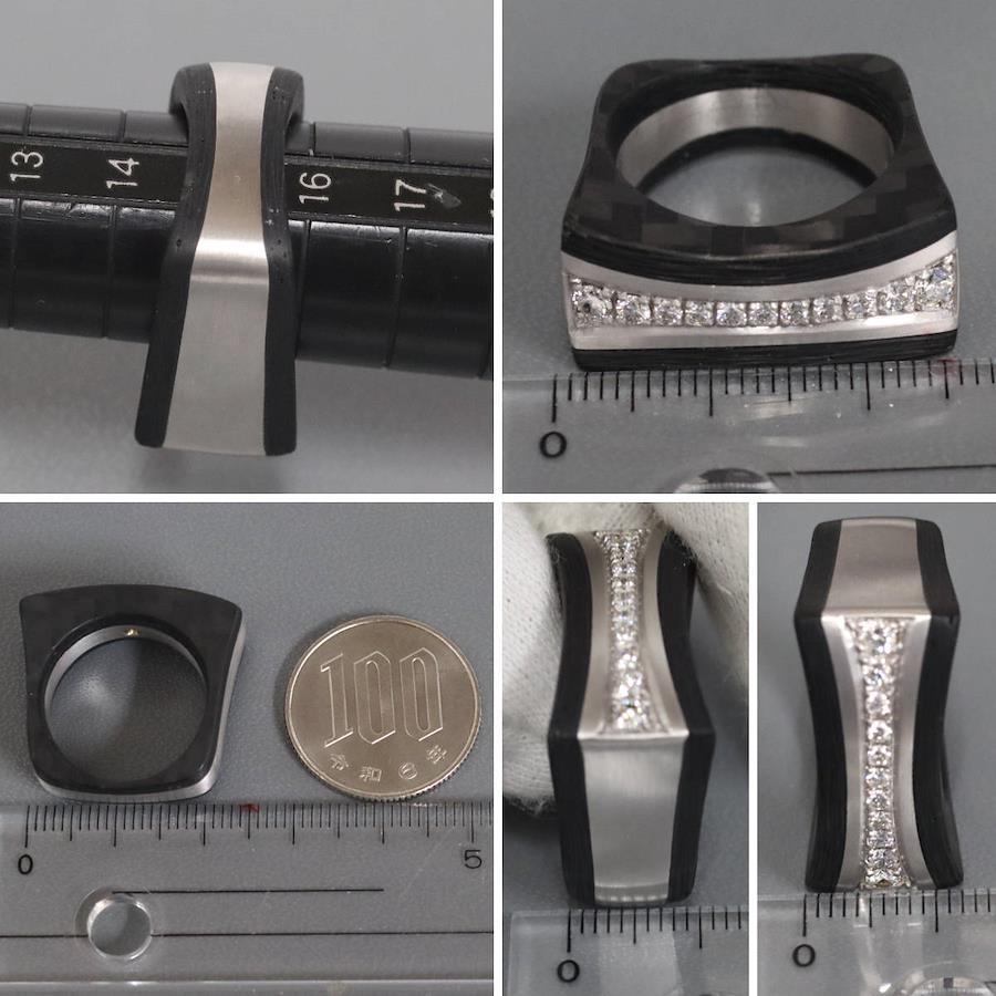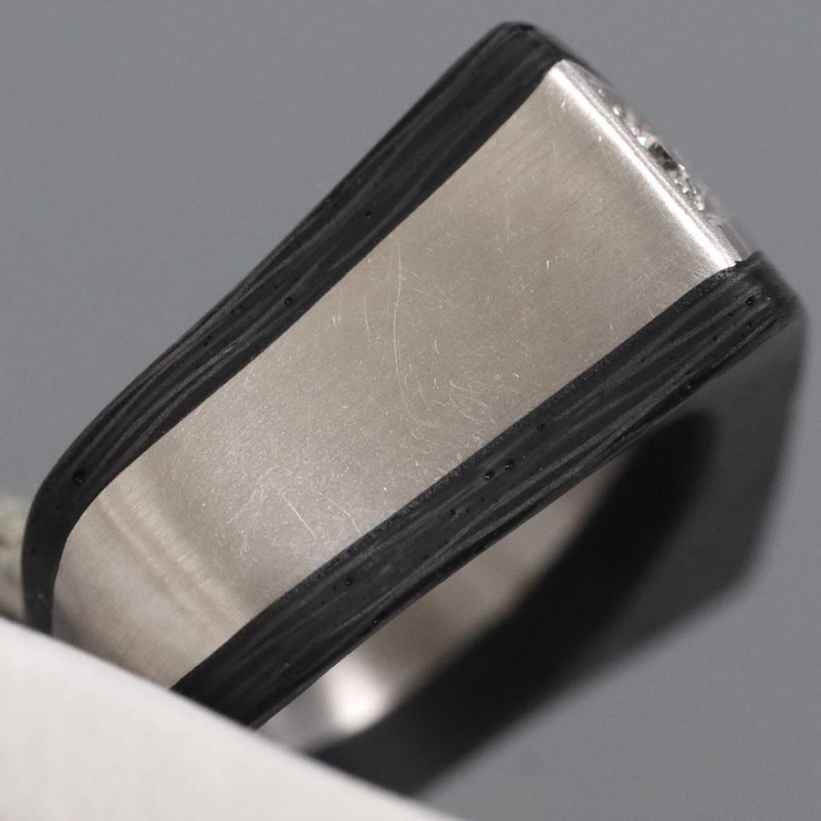 750/カーボンダイヤモンドリングの中古品です。カーボンで地金をはさみこんだ変わったデザインです。ダイヤモンドの石目の刻印はありません。ダイヤモンドは全体的にインクルージョンが少なく、照りよく輝きます。カーボンは部分的に劣化が見られます。地金にはわずかに小傷があります。+---+---+---+---+---+。{状態}AB{素材}750(K18WG)/カーボン{サイズ}当店計測約#15.5{リング幅}約7-12mm。{その他}13.2g。{付属品}なし(サービス箱をお付けします){お問合せ商品番号}25086037+---+---+---+---+---+。