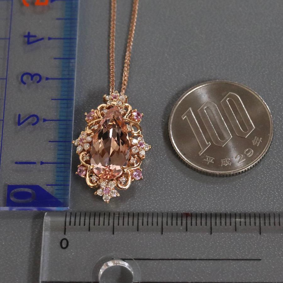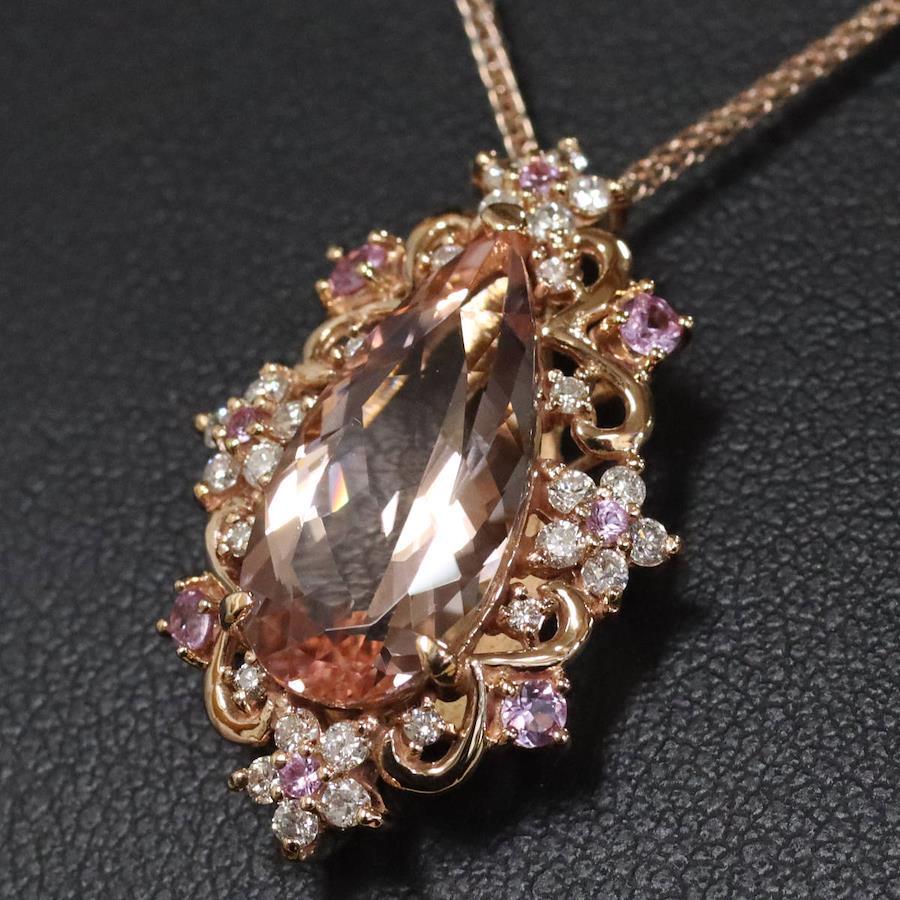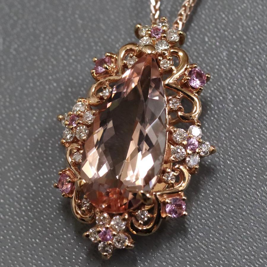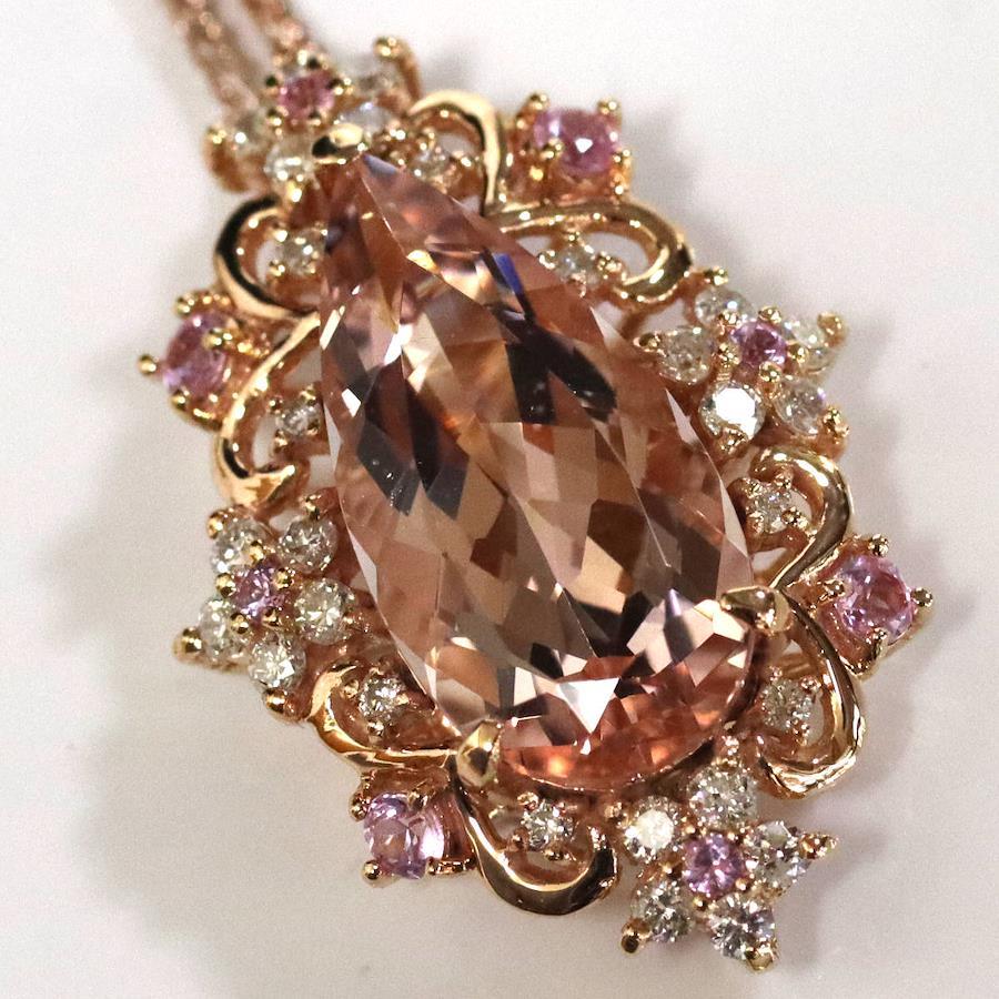 750/K18PGモルガナイトダイヤモンドサファイアペンダントの中古品です。モルガナイトはオレンジがかったピンク色で、透明度が高く照りがあります。ダイヤモンドは無色に近い色味で、インクルージョンが少なく照りがあります。サファイアはピンクとパープルの中間のような色で、インクルージョンが少ないです。地金には小傷があります。+---+---+---+---+---+。{状態}A{素材}トップK18PG,モルガナイト,ダイヤモンド,サファイアチェーン750(K18PG){サイズ}トップ約W17mm × H26mm。チェーン長約45cm(アジャスター付き){その他}M4.04ct,D0.33ct,S0.23ct,6.4g。{付属品}なし(サービス箱をお付けします){お問合せ商品番号}26026008+---+---+---+---+---+。