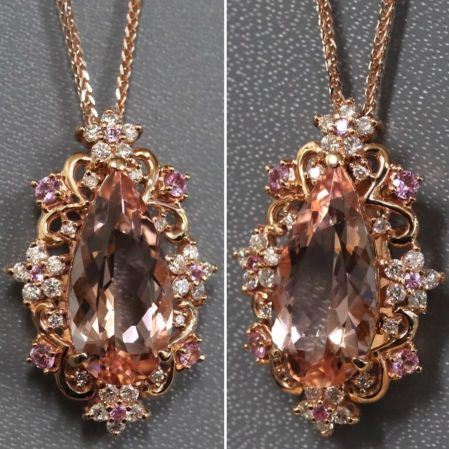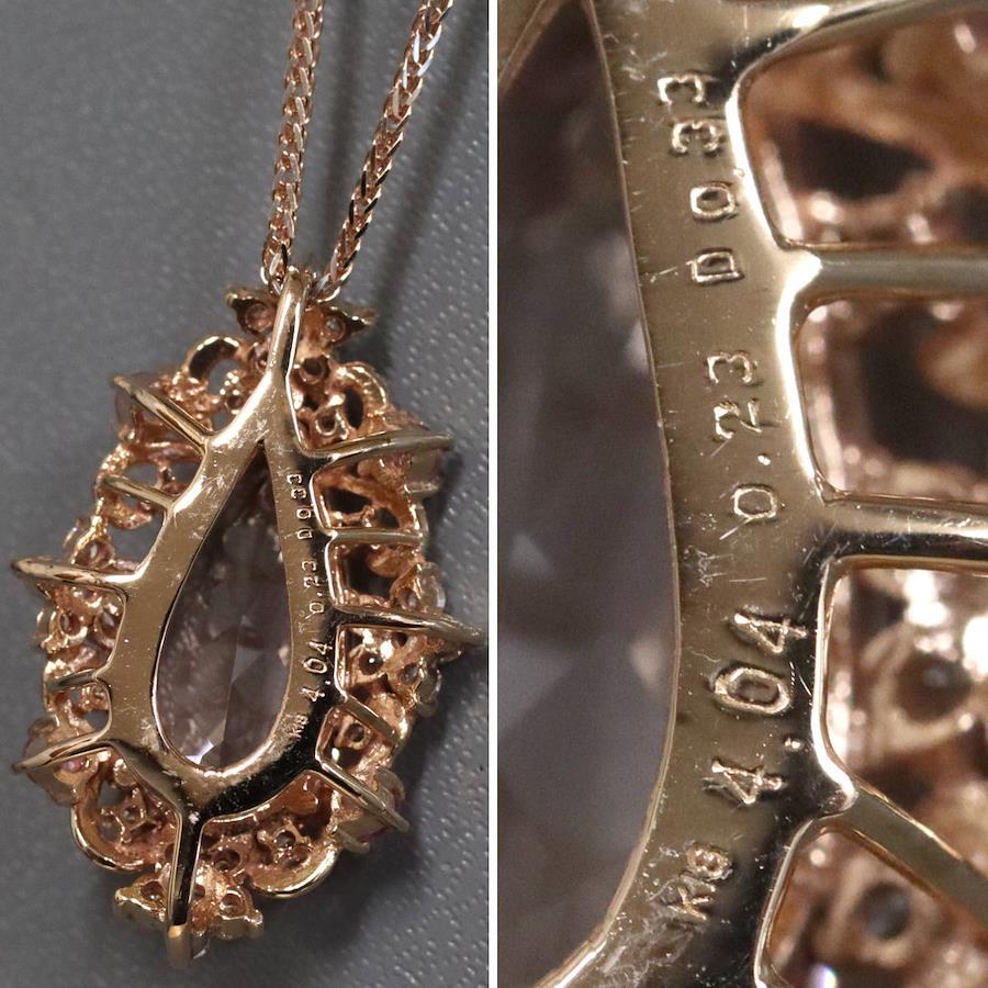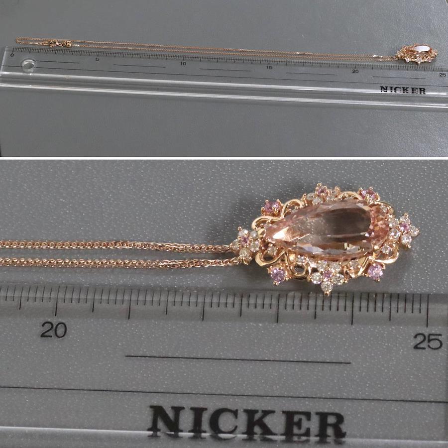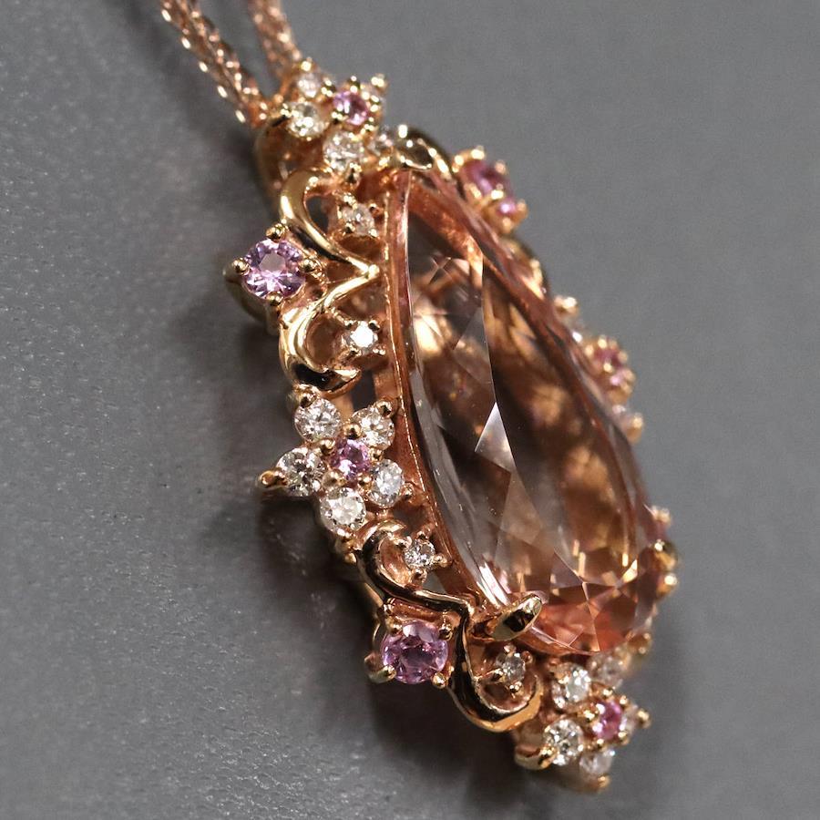 750/K18PGモルガナイトダイヤモンドサファイアペンダントの中古品です。モルガナイトはオレンジがかったピンク色で、透明度が高く照りがあります。ダイヤモンドは無色に近い色味で、インクルージョンが少なく照りがあります。サファイアはピンクとパープルの中間のような色で、インクルージョンが少ないです。地金には小傷があります。+---+---+---+---+---+。{状態}A{素材}トップK18PG,モルガナイト,ダイヤモンド,サファイアチェーン750(K18PG){サイズ}トップ約W17mm × H26mm。チェーン長約45cm(アジャスター付き){その他}M4.04ct,D0.33ct,S0.23ct,6.4g。{付属品}なし(サービス箱をお付けします){お問合せ商品番号}26026008+---+---+---+---+---+。