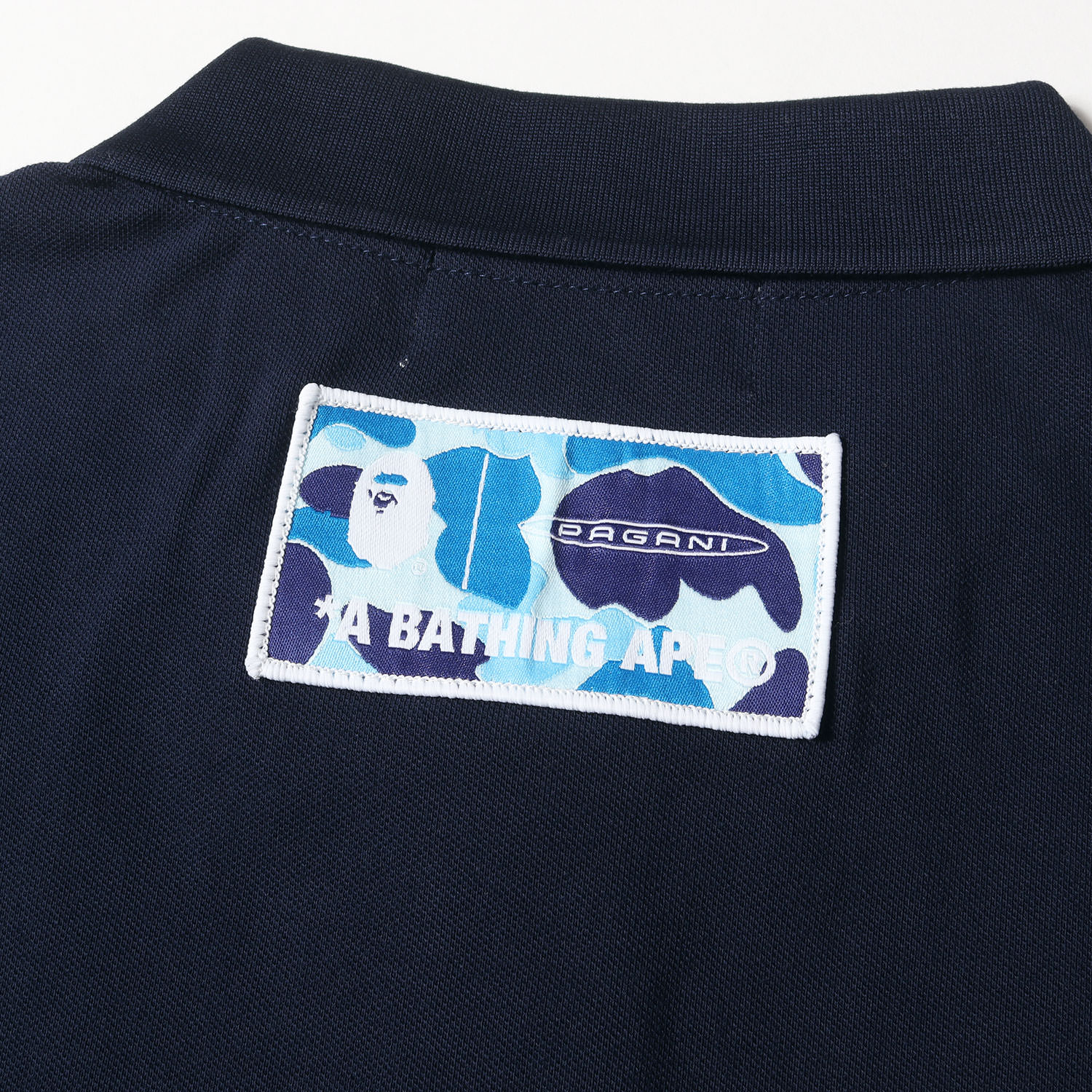 - イタリアの高級ハイパーカーメーカー“PAGANI”とのコラボシリーズです。こちらはストレッチ鹿の子生地を使用し、右袖をABCカモであしらったポロシャツになります。