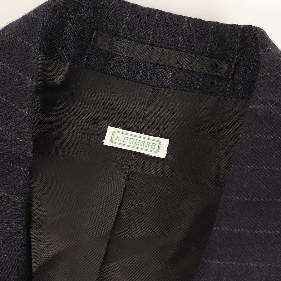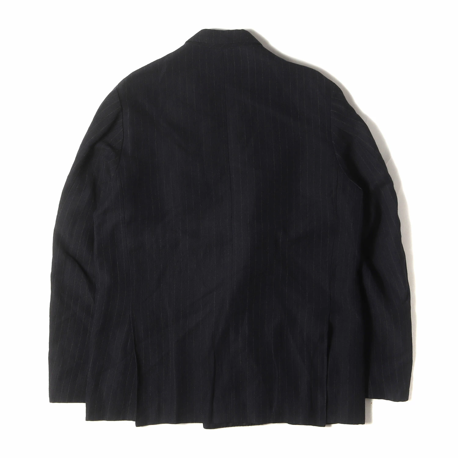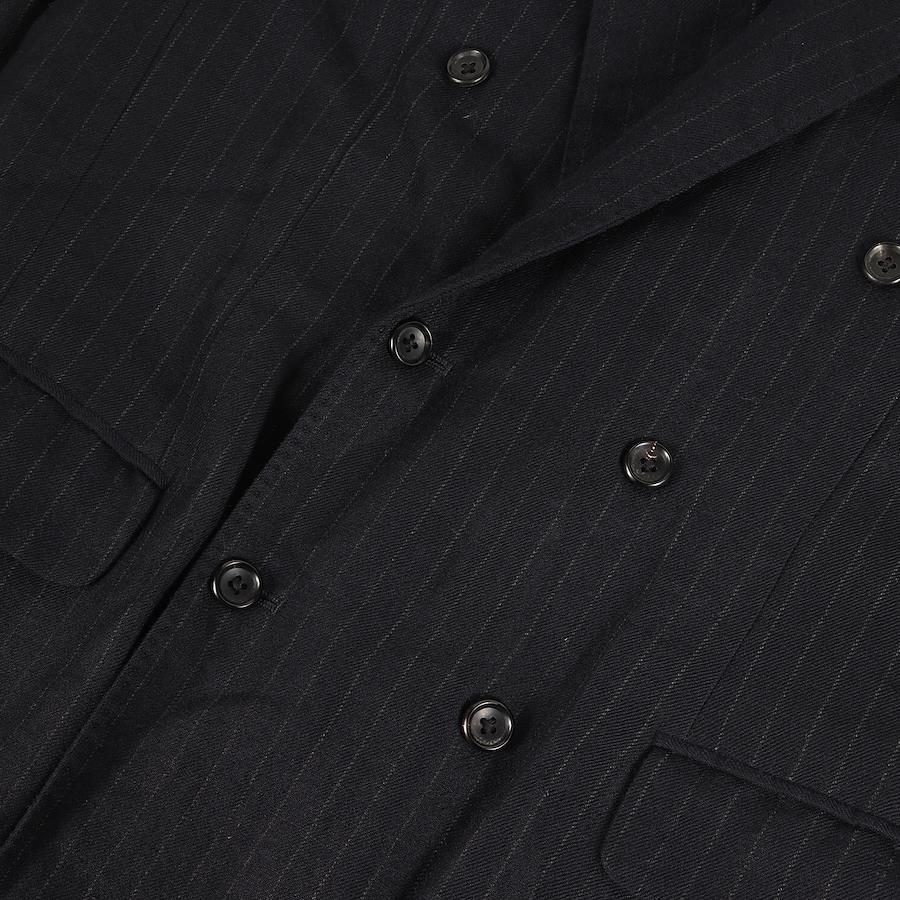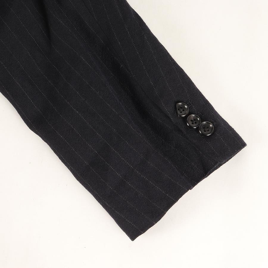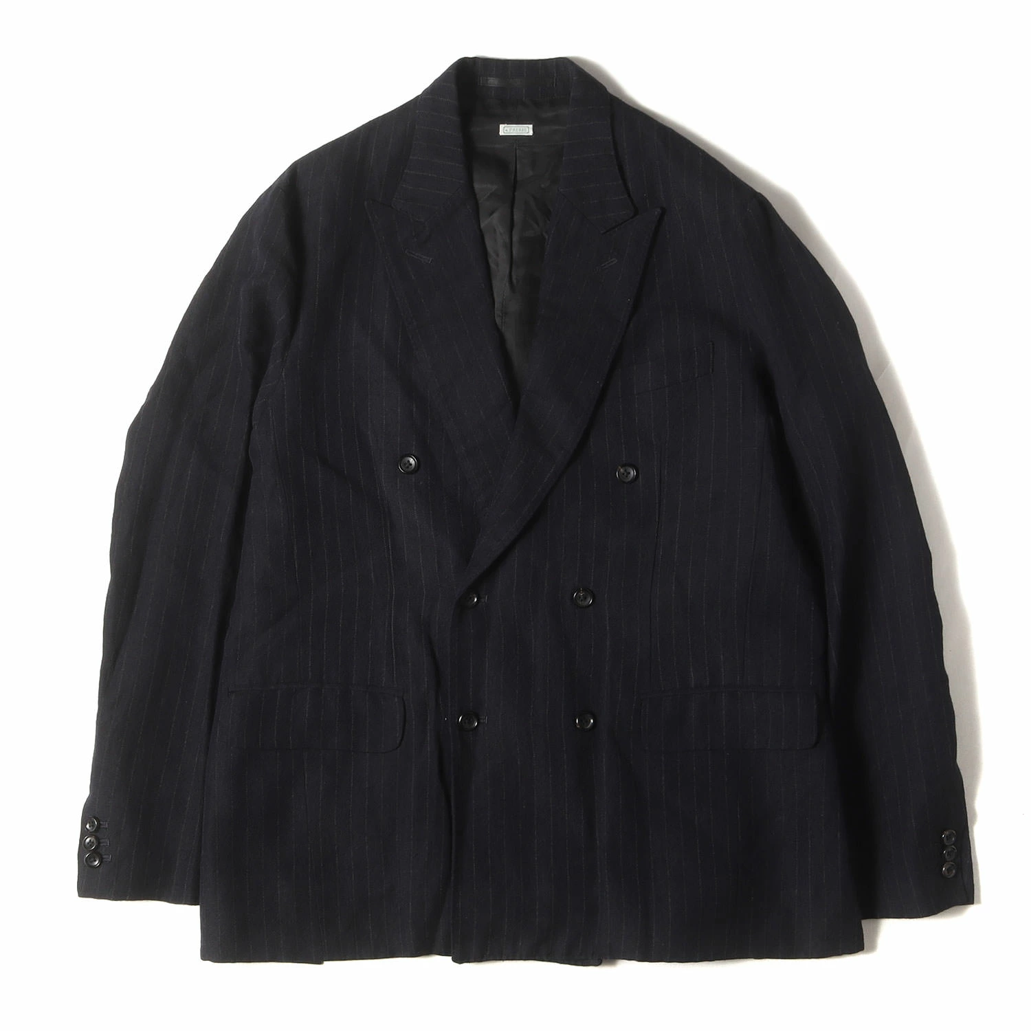 - ウール/リネン混紡生地を使用し、2つボタンで仕上げたダブルブレストジャケットです。全体にピンストライプをあしらったデザインです。ピークドラペル、本切羽、キュプラ総裏地がポイントです。