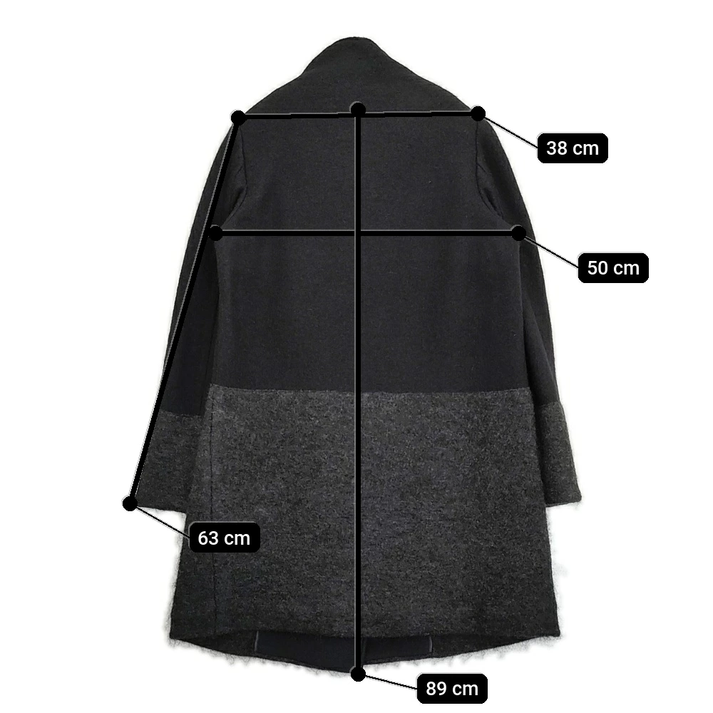 | 実寸サイズ | 肩幅:約38cm 着丈:約89cm 身幅:約50cm 袖丈:約63cm 備考 着丈:裏地上端の位置から採寸 ※採寸画像がある商品はハンガーに吊るした状態での計測のため、平置きでの採寸とは差が生じる場合がございます。平置きでの実寸サイズをご希望の場合は、ご購入前に必ずご質問ください。 ※記載以外のサイズが合わないことを理由とした返品はできませんので、 記載部分以外で実寸サイズの気になる箇所があれば必ず購入前にご質問ください。 |