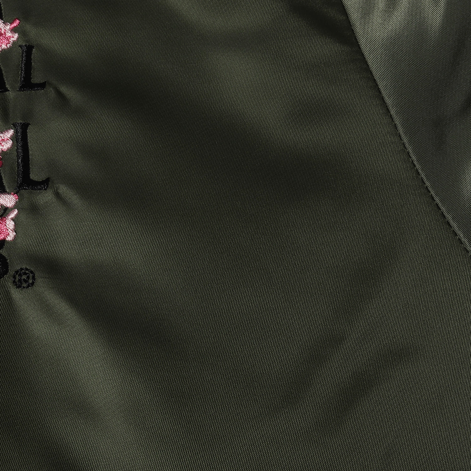 - こちらは“ALPHA“に別注をかけた裏地カモフラージュ柄のMA-1ジャケットです。定番のブランドロゴを桜と蝶でアレンジしたデザインになります。