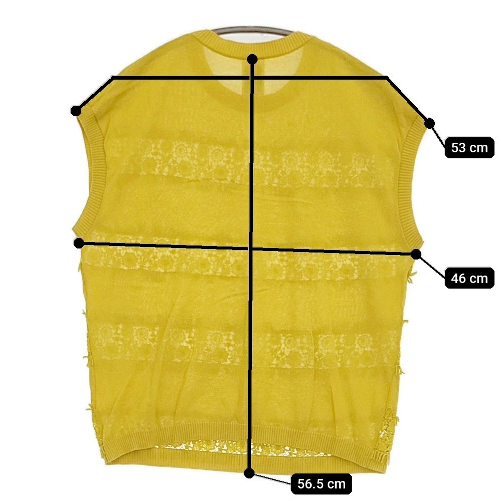 | 実寸サイズ | 肩幅:約53cm 着丈:約56.5cm 身幅:約46cm 備考 レース部分の空白部分には生地がなくカットワークのようになっています。 ※採寸画像がある商品はハンガーに吊るした状態での計測のため、平置きでの採寸とは差が生じる場合がございます。平置きでの実寸サイズをご希望の場合は、ご購入前に必ずご質問ください。 ※記載以外のサイズが合わないことを理由とした返品はできませんので、 記載部分以外で実寸サイズの気になる箇所があれば必ず購入前にご質問ください。 |