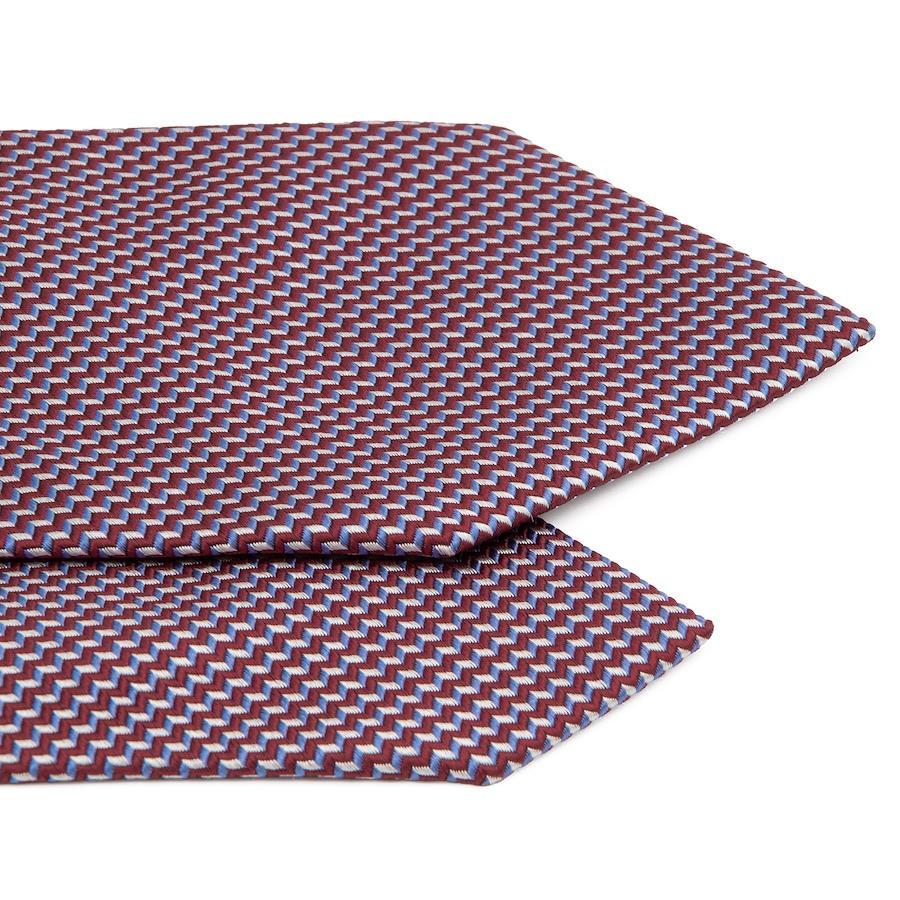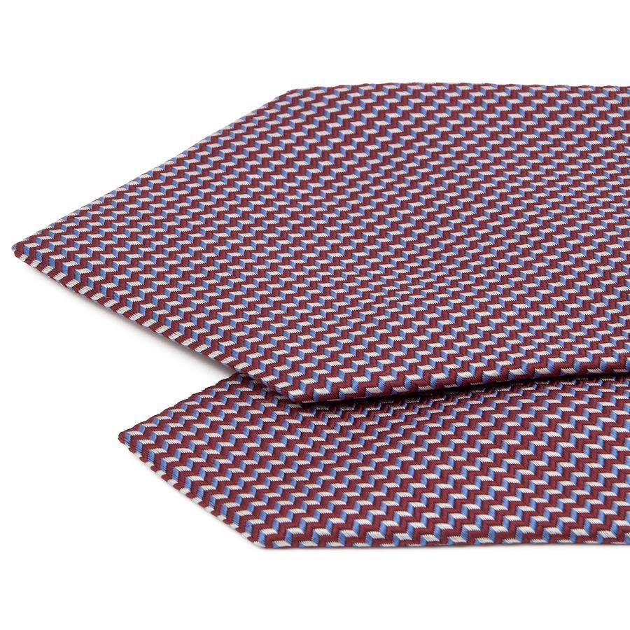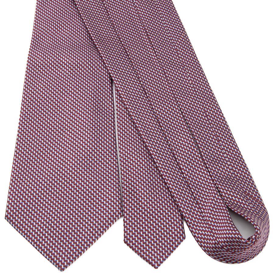 レッド・ブルー・シルバーの糸を、大変緻密なジャガード織りで、ギザギザのマイクロパターンに仕上げた一本。