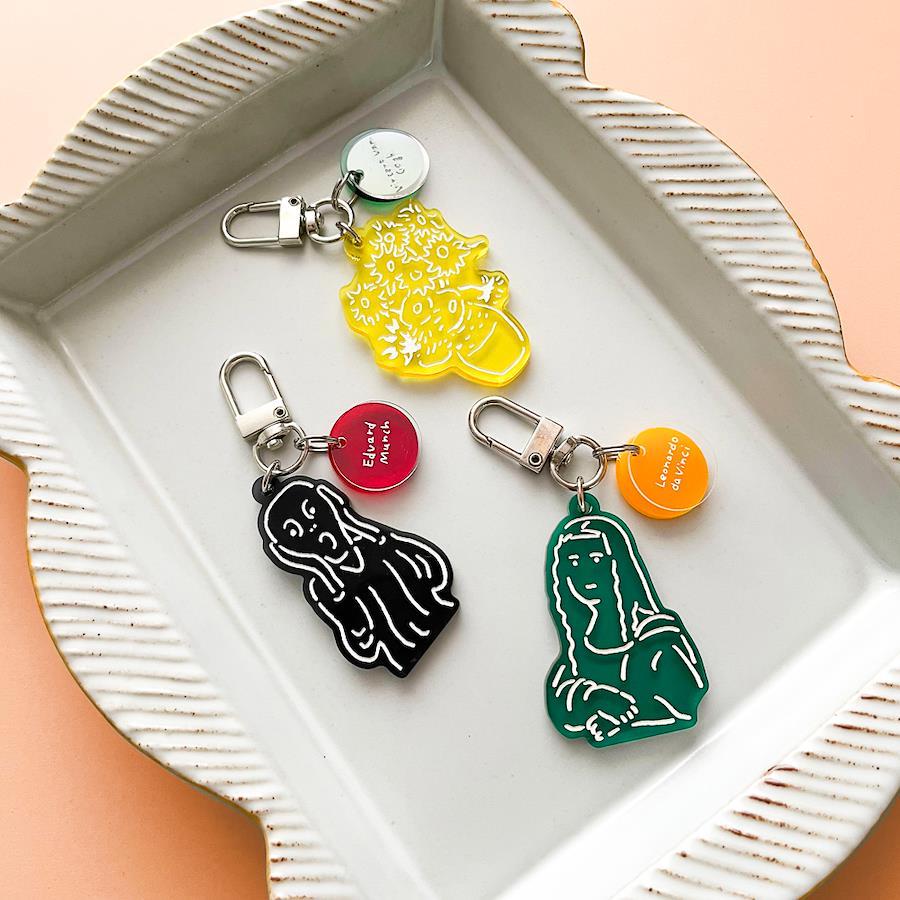 世界的に有名な名画をモチーフにしたアクリルキーホルダー。フェルメール、ミュシャ、ゴッホ、ロダン、ムンク、ダ・ヴィンチの6種類のデザインが揃い、それぞれの作品をラフなタッチでアレンジしています。