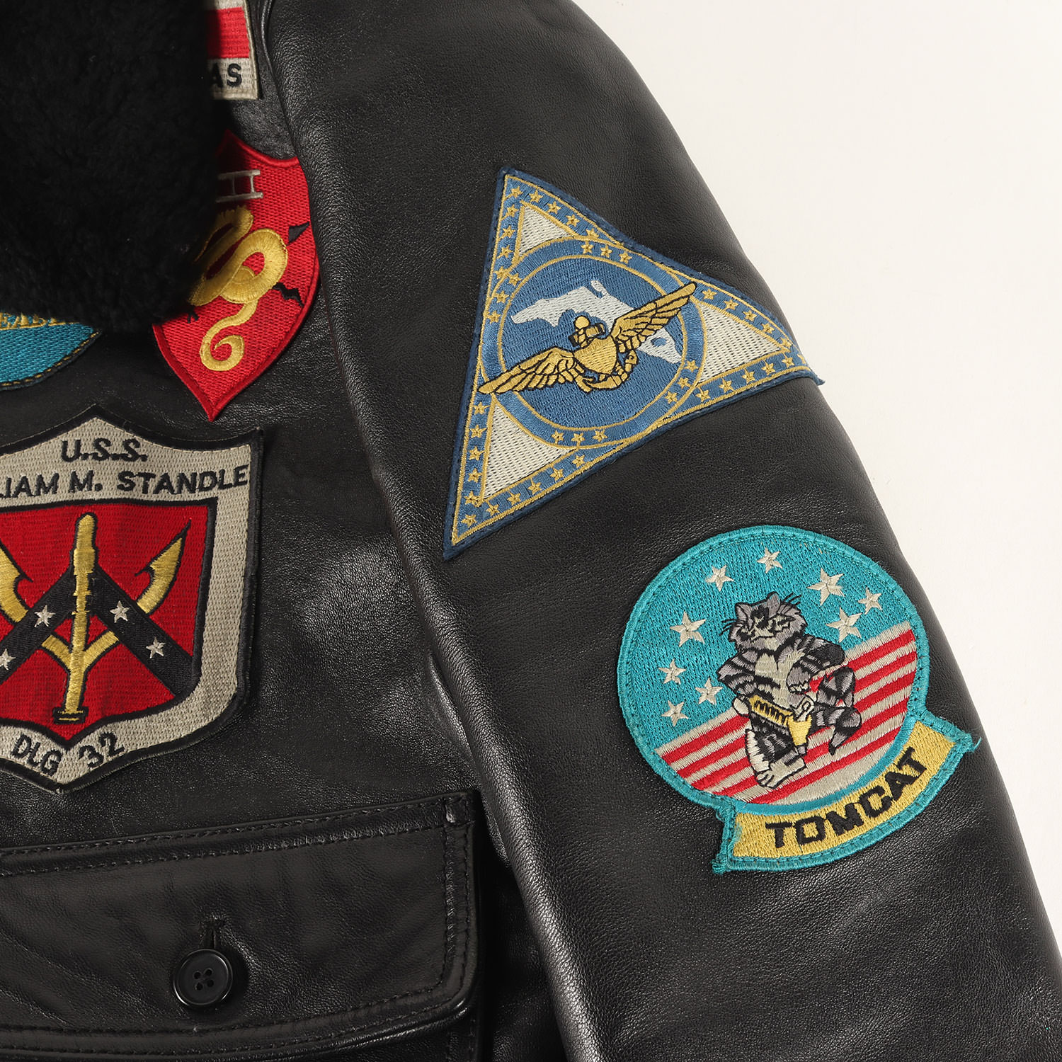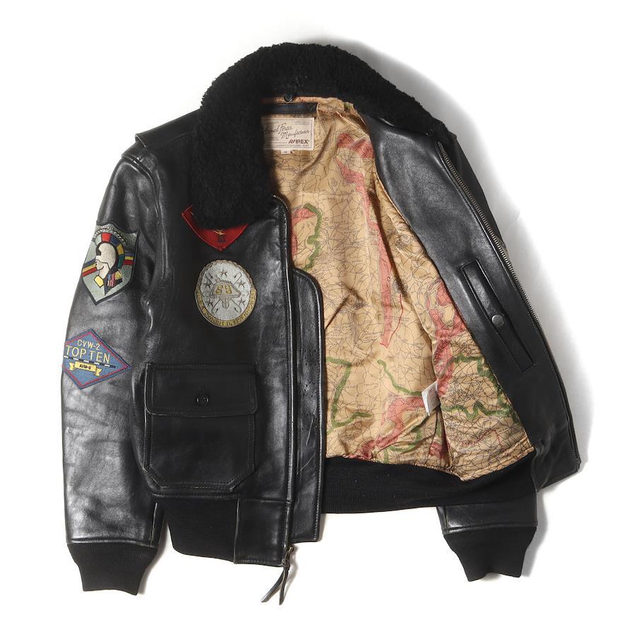 商品説明こちらは大人気のトップガンモデルです。厚手のシープスキンレザー素材を使用し、フルジップで仕上げたG-1フライトジャケットです。フルデコにてワッペンをデザインしています。裏地にあしらったマップ柄がポイントです。