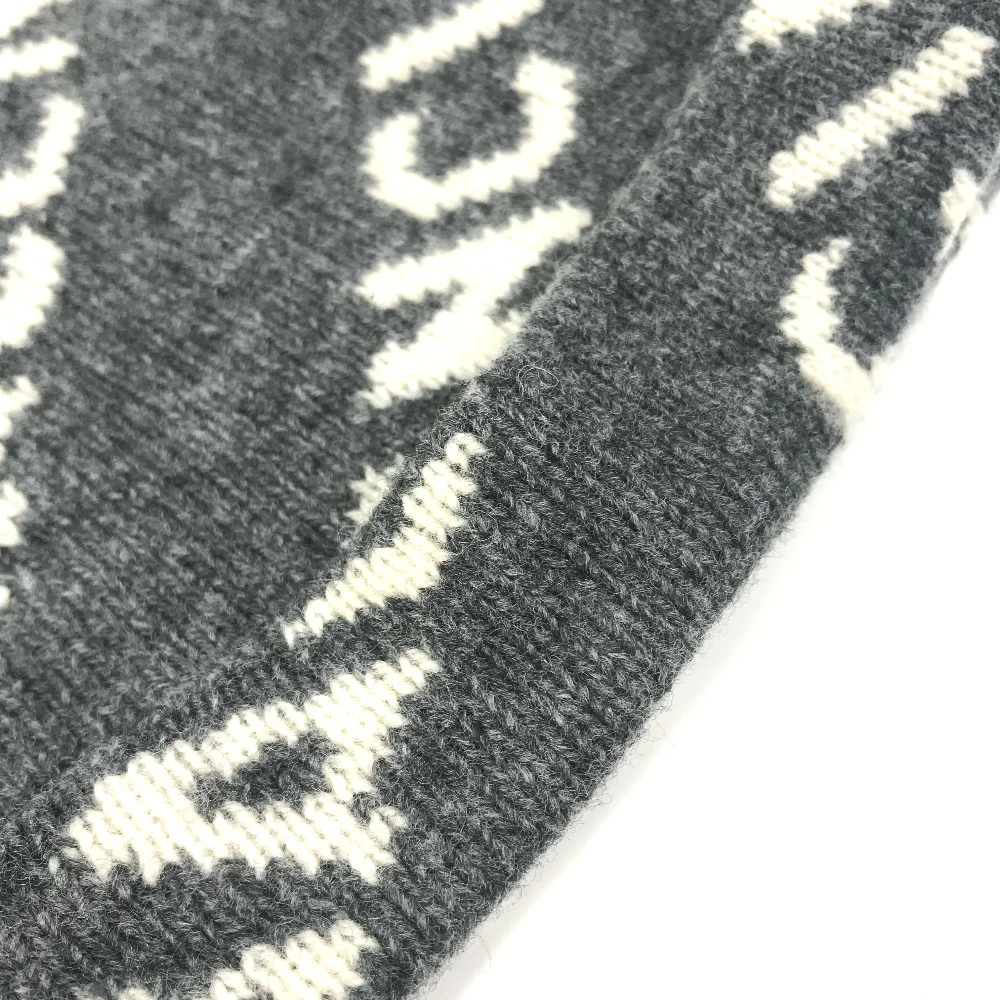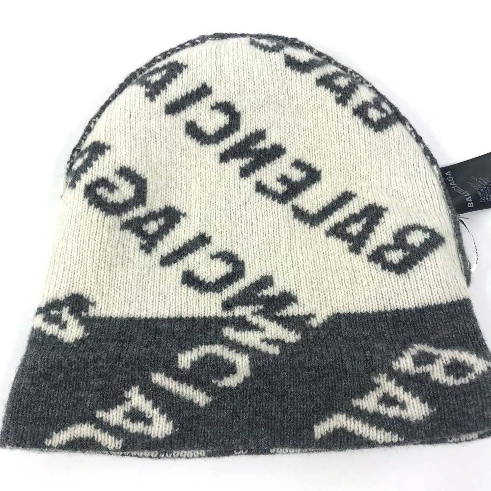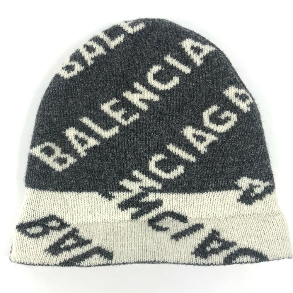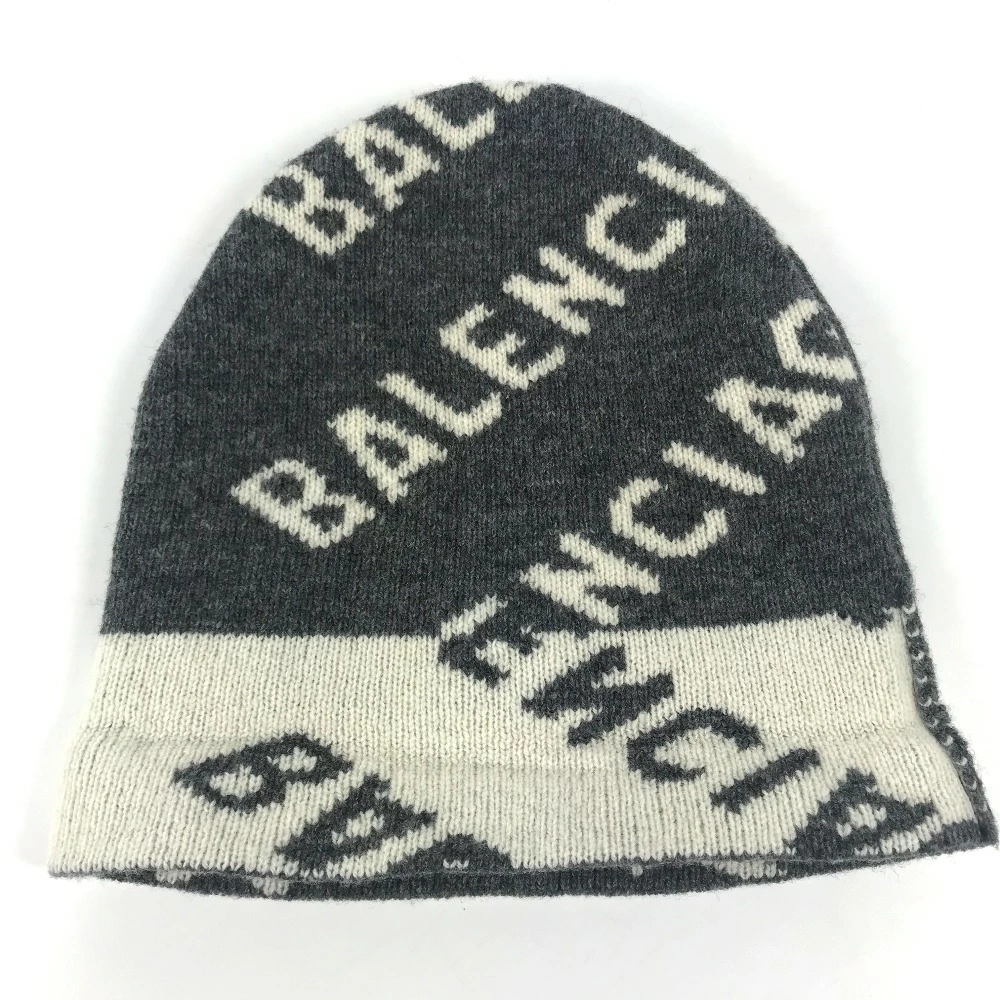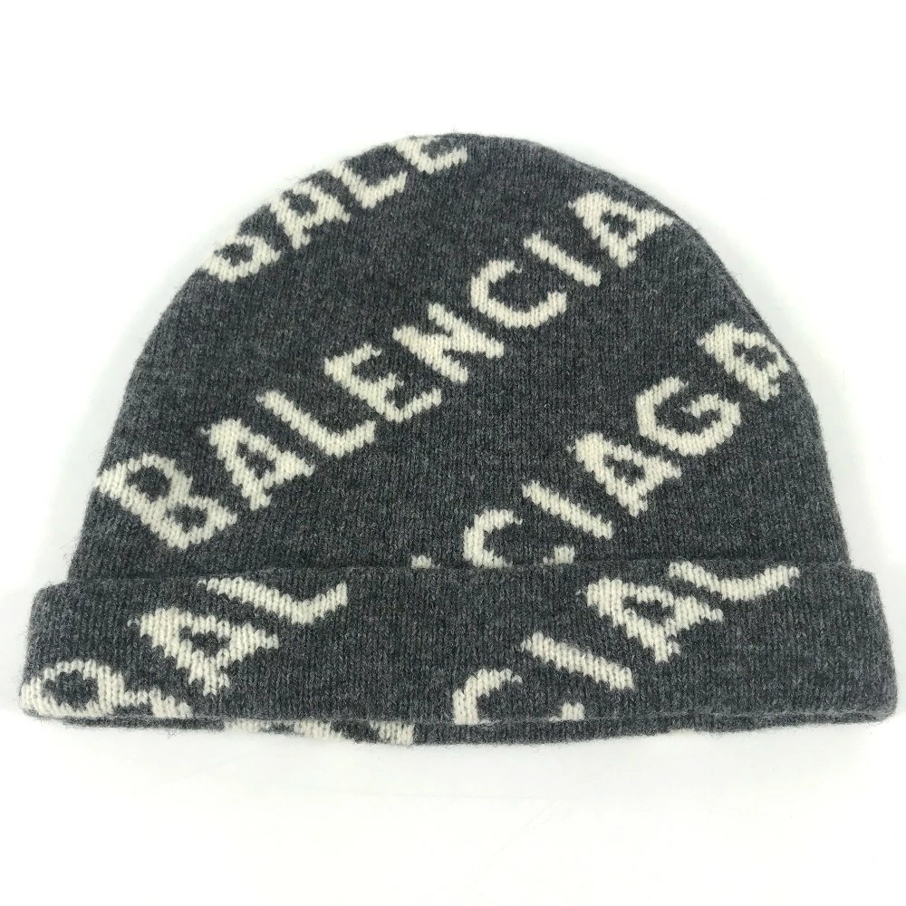 BALENCIAGA 633717 Beanie, Knit Cap, All-Over Logo, Wool/Polyester, Unisex, Gray, Pre-Owned