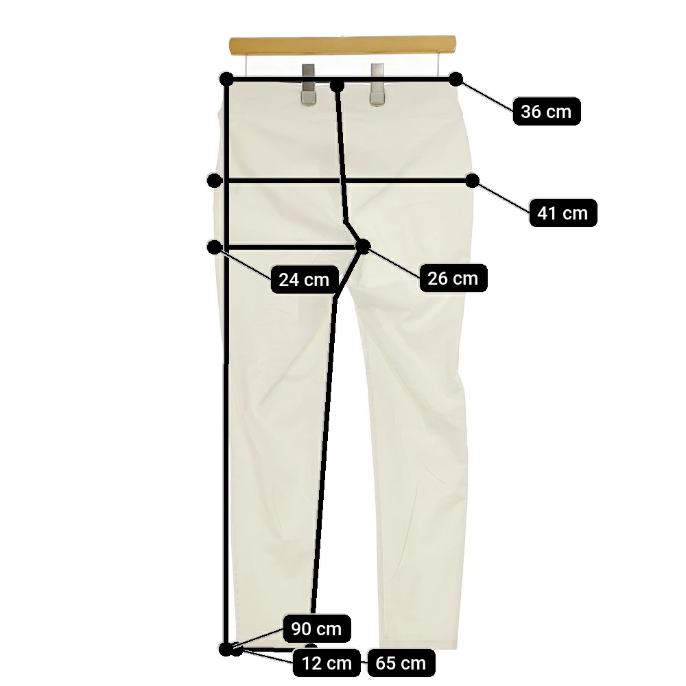 | 実寸サイズ | 総丈:約90cm ウエスト:約36cm ウエスト最長:約52cm 股上:約26cm 股下:約65cm ヒップ:約41cm ワタリ幅:約24cm 裾幅:約12cm ※記載以外のサイズが合わないことを理由とした返品はできませんので、 記載部分以外で実寸サイズの気になる箇所があれば必ず購入前にご質問ください。 |