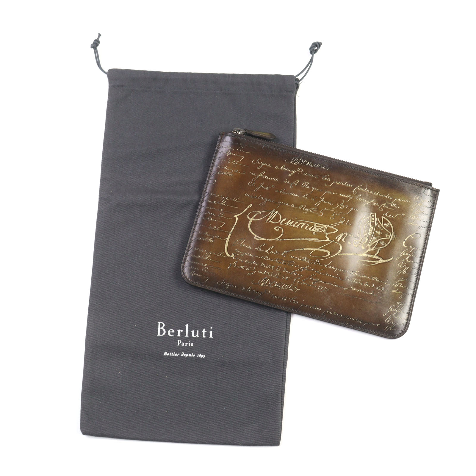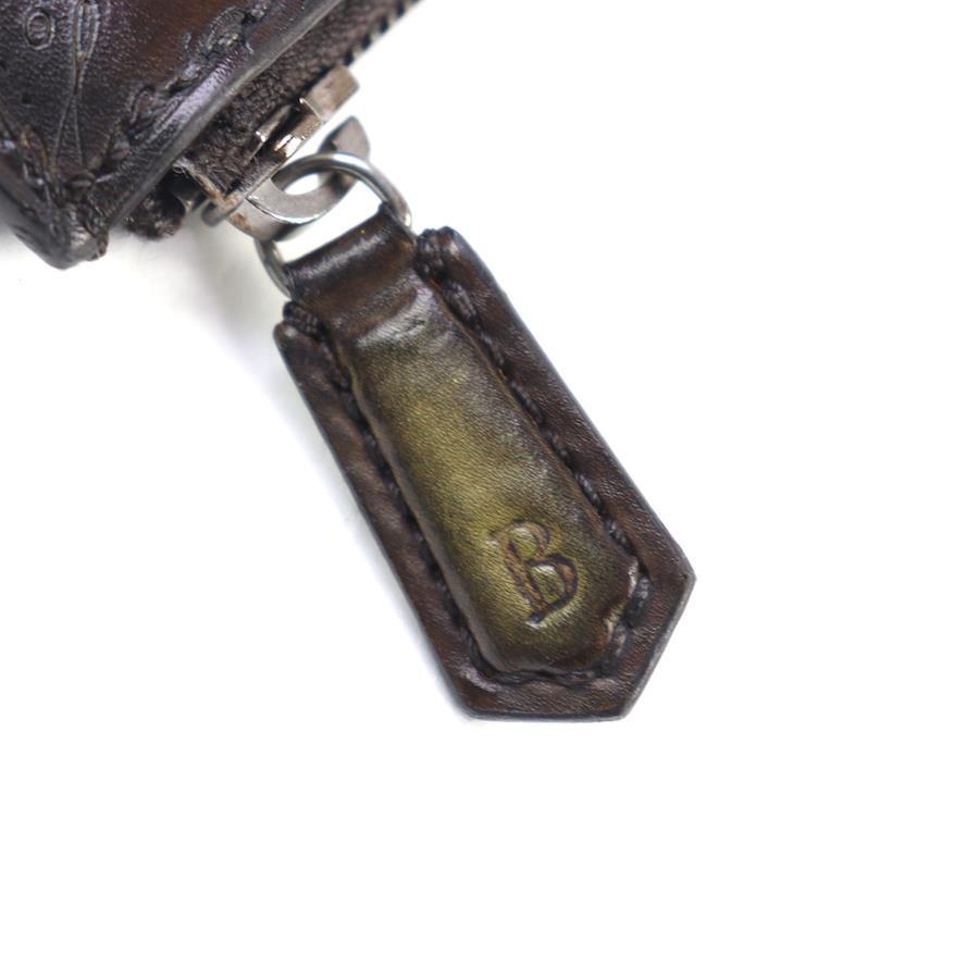 Berluti NINO PM clutch bag with engraved logo, patina calligraphy, and brown Scritto leather.