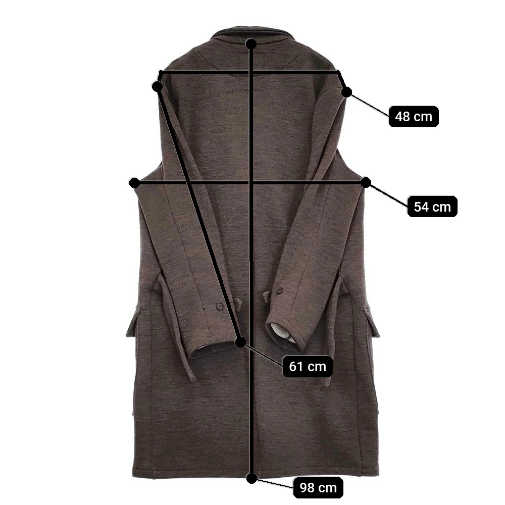 | 実寸サイズ | 肩幅:約48cm 着丈:約98cm 身幅:約54cm 袖丈:約61cm ※採寸画像がある商品はハンガーに吊るした状態での計測のため、平置きでの採寸とは差が生じる場合がございます。平置きでの実寸サイズをご希望の場合は、ご購入前に必ずご質問ください。 ※記載以外のサイズが合わないことを理由とした返品はできませんので、 記載部分以外で実寸サイズの気になる箇所があれば必ず購入前にご質問ください。 |
