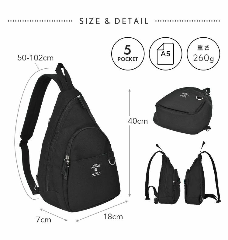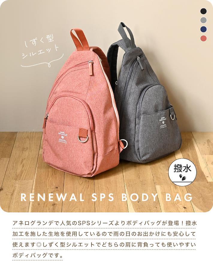 【リニューアルSPSボディバッグ】アネログランデで人気のSPSシリーズよりボディバッグが登場!撥水加工を施した生地を使用しているので雨の日のお出かけにも安心して使えます♪A5サイズやペットボトルが入り、ポケットも豊富で使い勝手は抜群◎しずく型シルエットでショルダーを付け替えればどちらの肩に背負っても使いやすいボディバッグです。