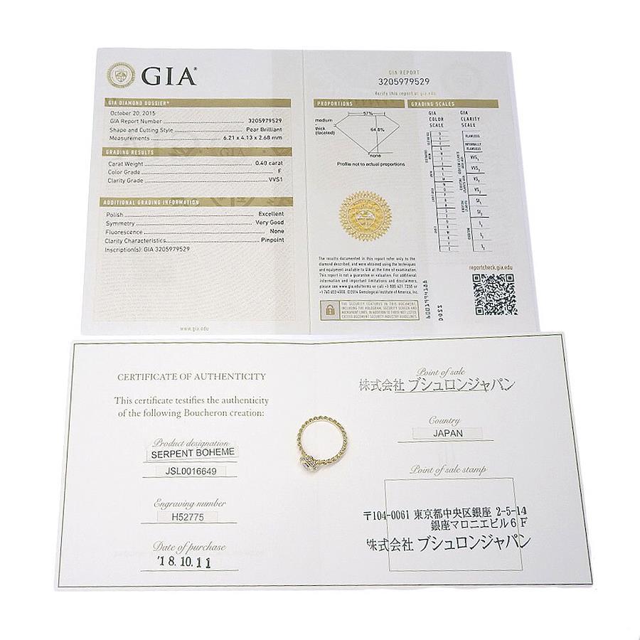 ■Brand: Boucheron■Product Name: Ring■Model Name: Serpent Bohème■Model Number: JSL0016649■Suitable for: Women■Serial Number: H527**■Material: 18K Yellow Gold / Diamond■Weight: Approx. 2.3g■Gemstones: 0.4ct Diamond■Clarity: VVS1■Symmetry: Very Good■Fluorescence: None■Diamond Shape: Pair Brilliant Cut■Overall Cut Rating: Excellent■Accessories: Warranty, Certificate of AuthenticitySize ■Actual Size: 8.5 (measured by our company)*As this is a pre-owned item, the actual size may differ slightly from the brand's specifications.■Ring Inner Diameter: Approx. 15.6mm■Ring Width (Min): Approx. 2mm■Ring Width (Max): Approx. 10mmCondition ■Item Rank: ARankNewly Polished■Metal Parts: Minor Scratches■NotesPlease feel free to contact us if there is anything unclear from the images.*Item condition is indicated according to our standards.