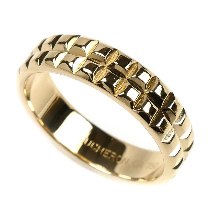 Brand: BoucheronProduct Name: Pointe de Diamant RingType: Men'sMaterial: 18K Yellow GoldStamp: Boucheron OR750Ring Size: Approx. 19Top Width: Approx. 5.5mmBottom Thickness: Approx. 1.4mmJAPAN: Approx. 19EU: 59US: 9.5Country of Origin: FranceWeight: Approx. 7.6gAccessories: NoneCondition: Rank APre-owned item in good condition, with some signs of use.Although the item has been polished, there may be some minor scratches that cannot be removed. Please note that as this is a display item, there may be discoloration, minor wear, or minor scratches.