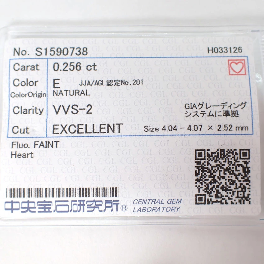 Product DetailsProduct Rank: N RankNatural Stone: DiamondCarat: 0.256ctColor: EClarity: VVS-1Cut: EXELLENTFluorescence: FAINTCertified by the Central Gem LaboratoryProduct DetailsA high-quality diamond with excellent colorless clarity and brilliance.Additional charges (including tax) for platinum 900 setting: 6-prong earrings → +8,000 yen and up; 6-prong pendant top → +8,000 yen and up; 45cm sliding 0.8mm curb chain → +12,000 yen; 6-prong ring → +23,000 yen and up. Please let us know if you have any other desired settings.