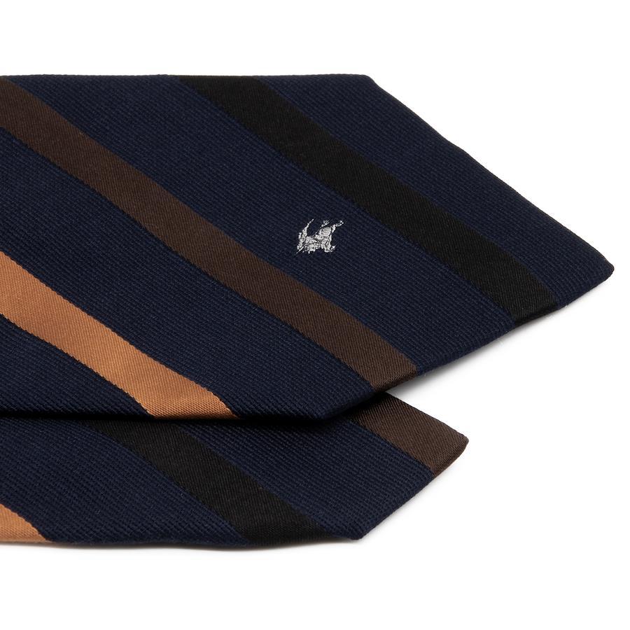 日本製の確かな品質を誇るシルクジャガードが、ネイビーブルーを基調とした地に、メタリックブラウンとブラックの知的なストライプを描き出します。