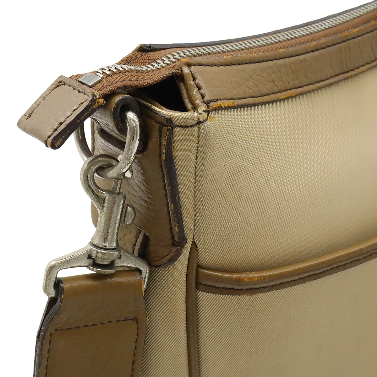 【コンディション】[外側]角、フチ、プルスレ、汚れ、若干のシミ、ポケット内ノリ染み[内側]上部レザー薄汚れ[ショルダー]金具跡、若干のスレ[金具]くすみ、メッキスレ