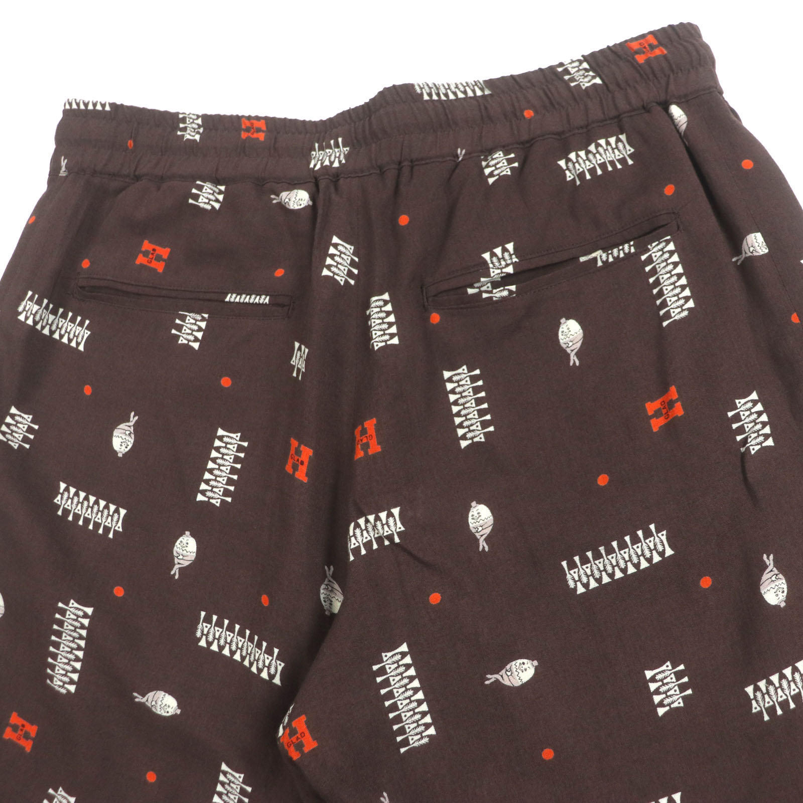 パンツウエスト:約80cm~90cm ウエストゴムと紐で調節可能 股上:約31cm 股下:約19cm 裾幅:約27cm わたり幅:約33cm