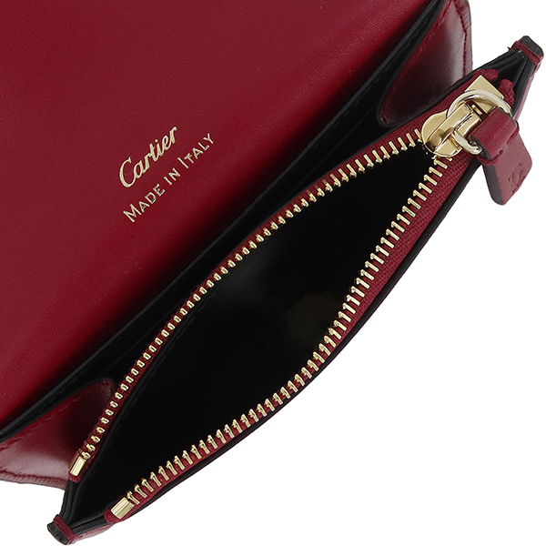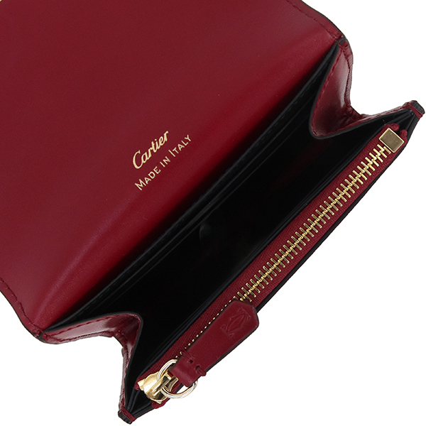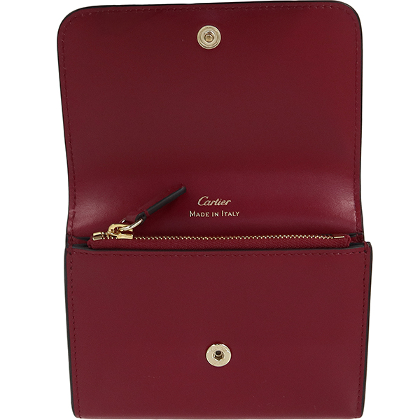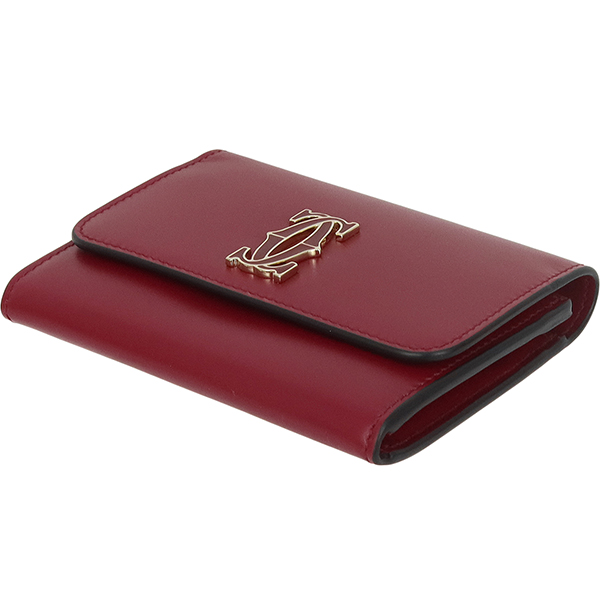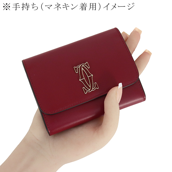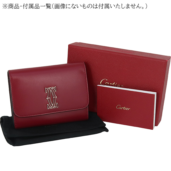 【ブランド】CARTIER カルティエ------------------------【商品名】ウォレット C ドゥ カルティエ------------------------【ライン】DOUBLE C DE CARTIER------------------------【型 番】L3001910------------------------【製造国】イタリア------------------------【カラー】[全体] チェリーレッド(ワインレッド)[金具] ゴールド------------------------【素 材】[全体] カーフレザー------------------------【サイズ】約:横11cm × 高さ8.5cm × マチ1cm------------------------【重 量】約80g------------------------【機 能】ホック開閉マチ付きポケット×1ファスナーコインケース×1カードポケット×4フリーポケット×1------------------------【付属品】純正箱 / 保存袋ケア冊子※箱に僅かなテープ跡がございます。------------------------商品ランク 【N】 (新品※製造・輸送・検品の際にどうしてもついてしまう僅かなスレ・押し跡・ほつれ等がある場合がございます。)