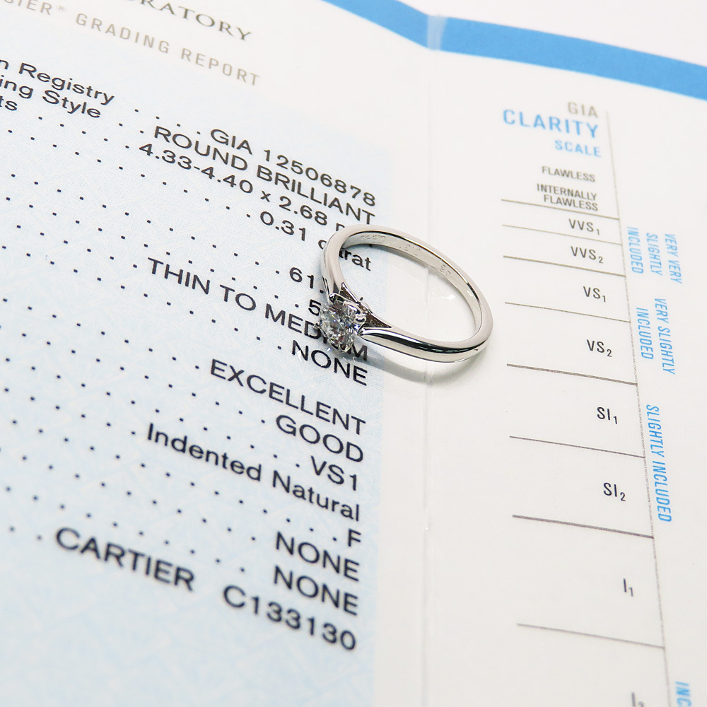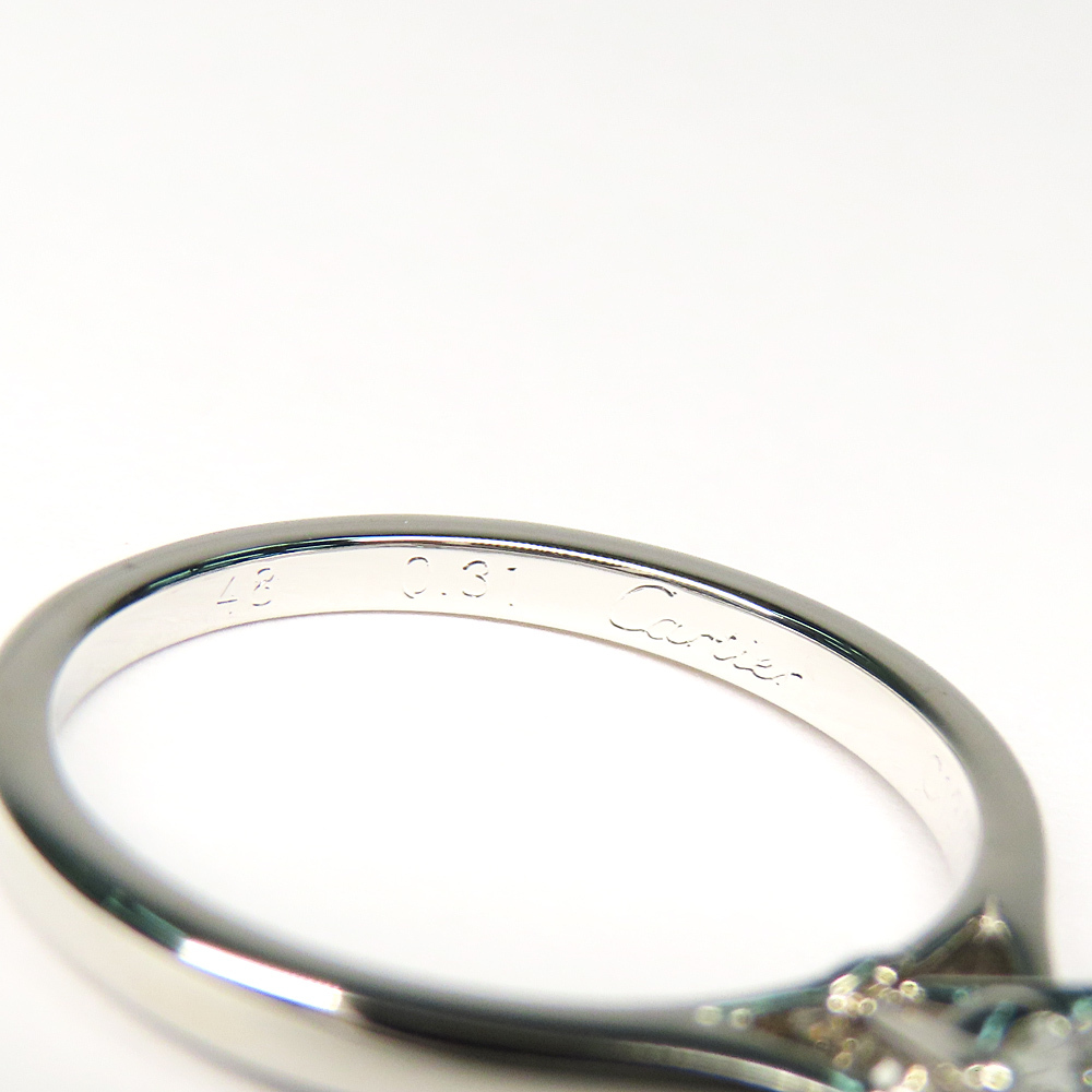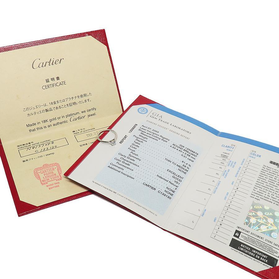 Product Rank: AProduct Condition: This item appears to have been well-cared for since purchase.It has been polished at our affiliated jewelry workshop, so it is in excellent condition with almost no scratches.Please see the images for details and feel free to contact us with any questions.*The texture and color may appear different from the actual product depending on the shooting environment and your monitor settings.Brand: CartierProduct Name: Solitaire Diamond RingModel Number:Serial No.:Stamp: 950PTMaterial: Platinum 950Stone: 0.31ct Diamond, F/VS1/EX/NONEColor: PlatinumSize: #48, Width: 1.7mmPlease note that slight variations may occur.Weight: Approx. 2.8gPlease note that slight variations may occur.Reference Price:Accessories: Warranty (2003 domestically authorized), GIA Certificate