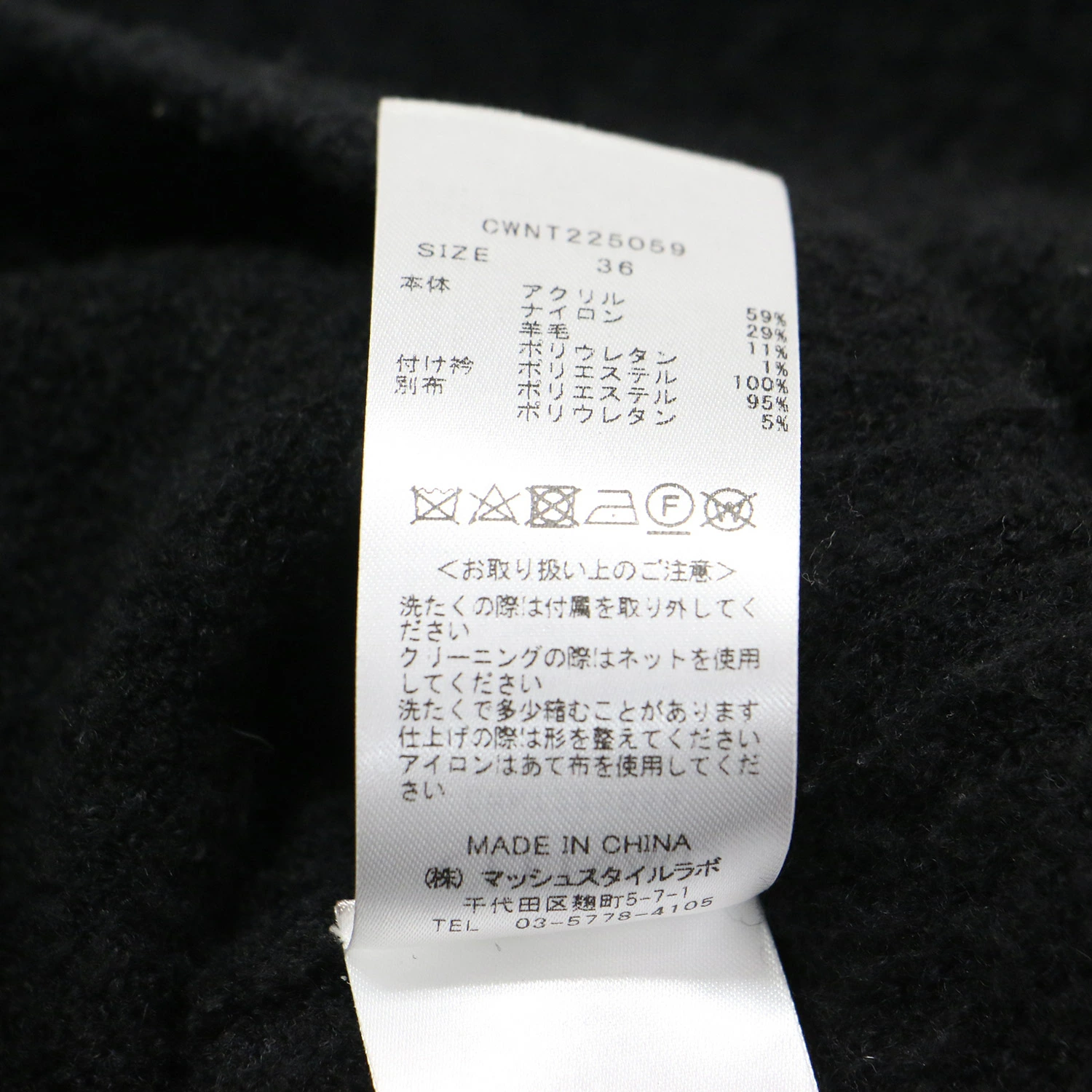 - 本体 アクリル 59% ナイロン 29% ウール 11% ポリウレタン 1% 付け衿 ポリエステル 95% ポリウレタン5%