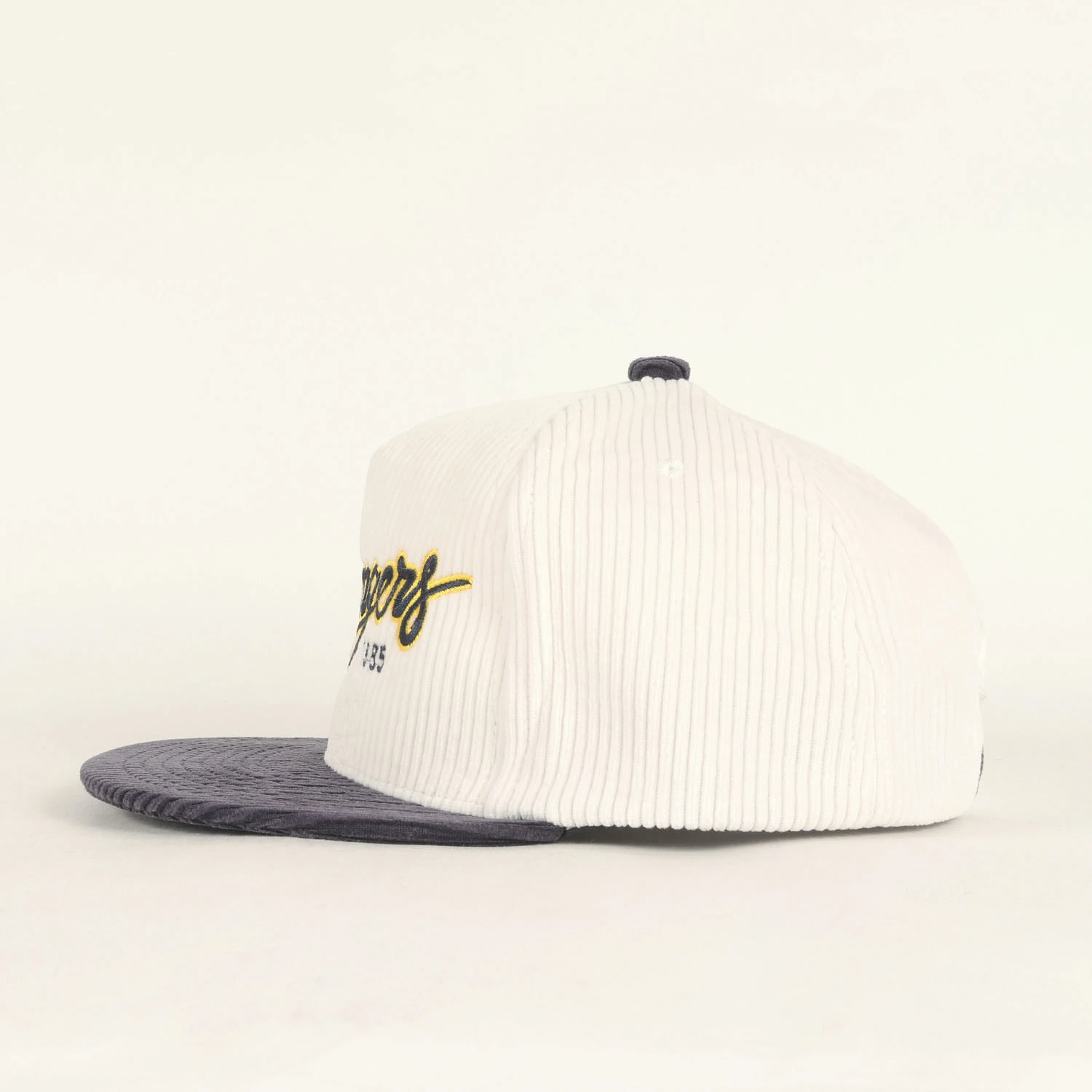 - 太畝コーデュロイ生地を使用した5パネルのスナップバックキャップになります。