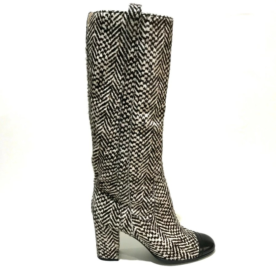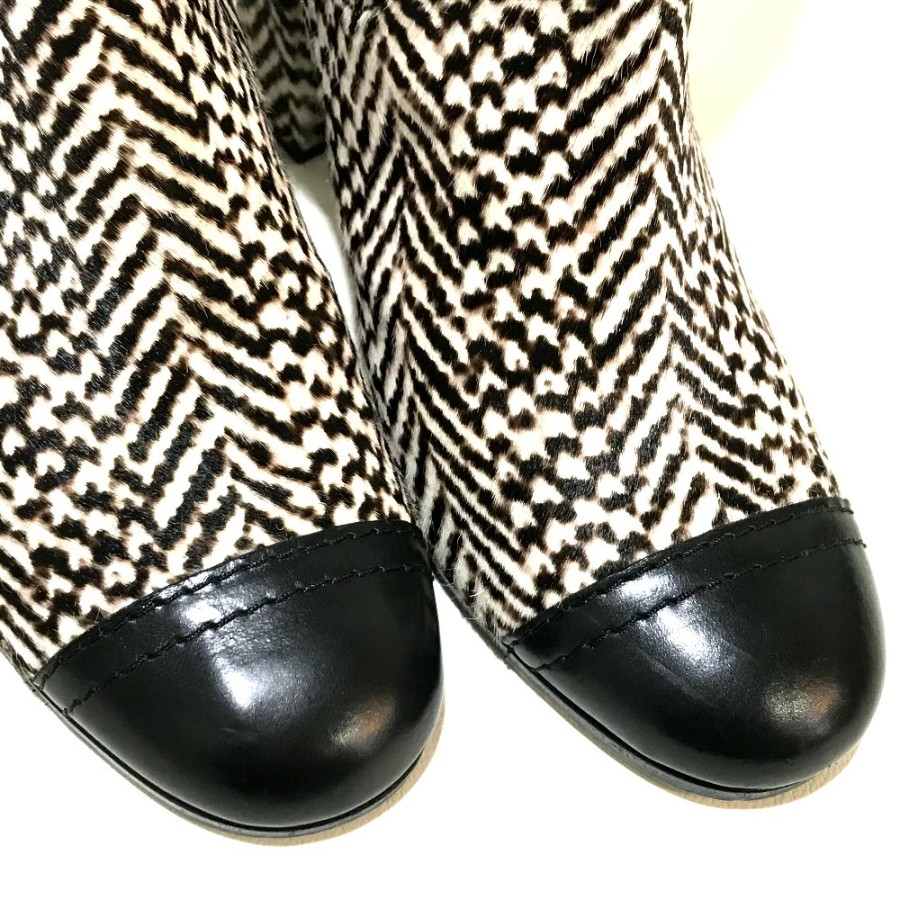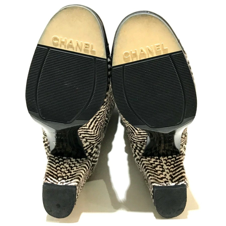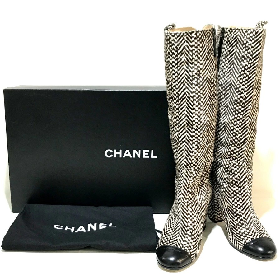 CHANEL women's boots, side zip, chunky heel, calfskin, black/black/beige. [Used]