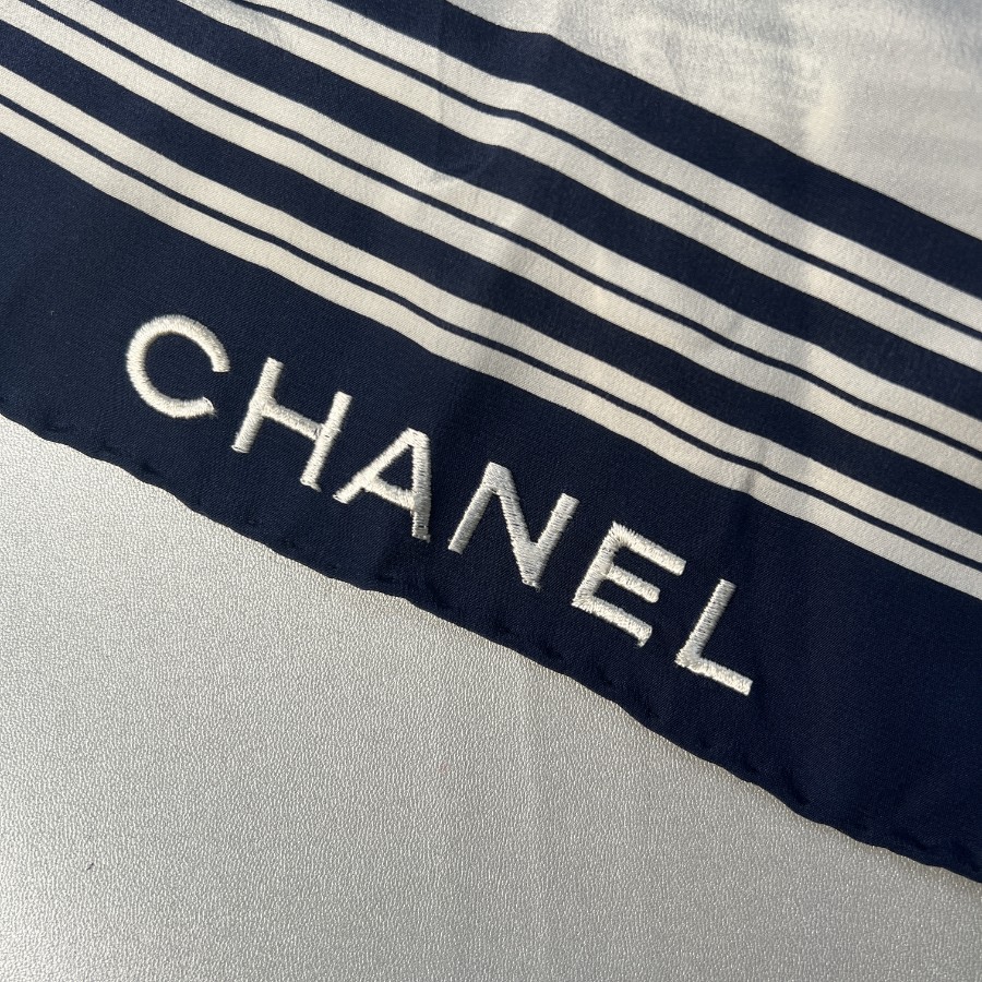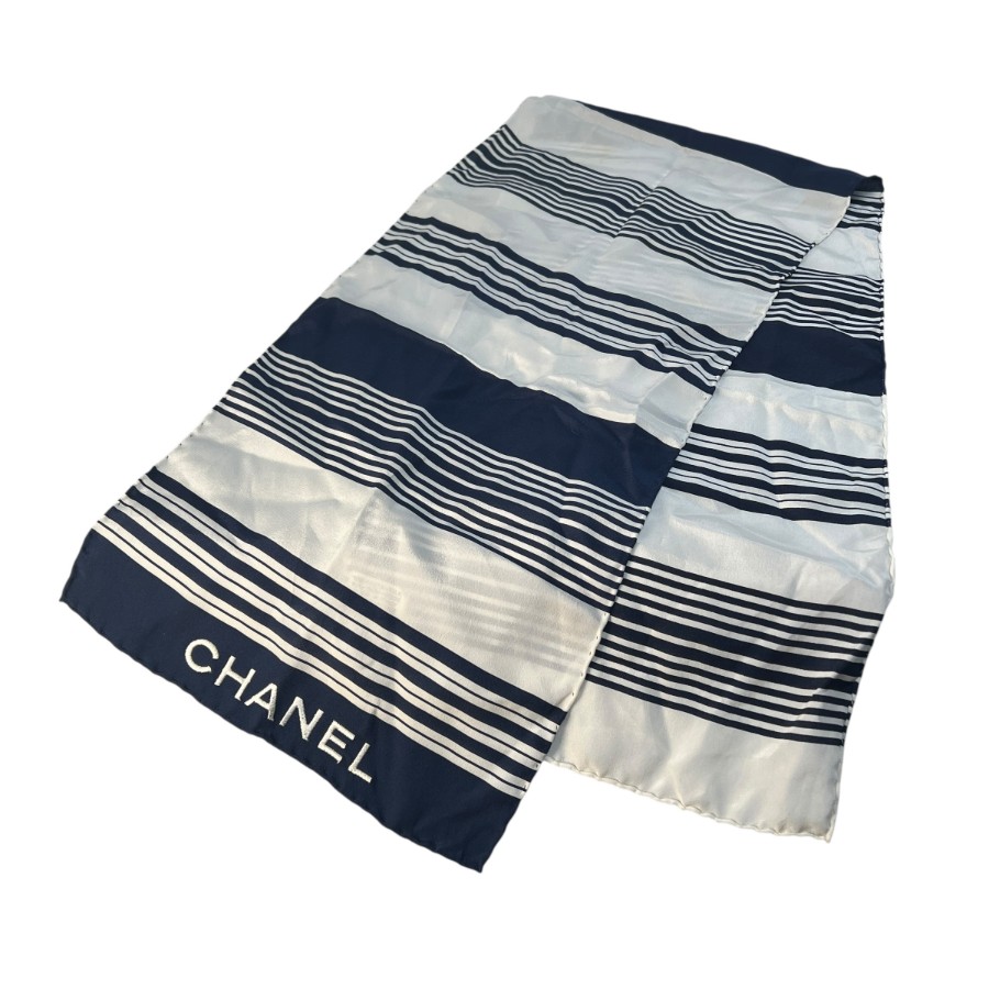 【アイテム】良品 CHANEL シャネル ロゴタグ付き シルク スカーフ ブルー A-12366