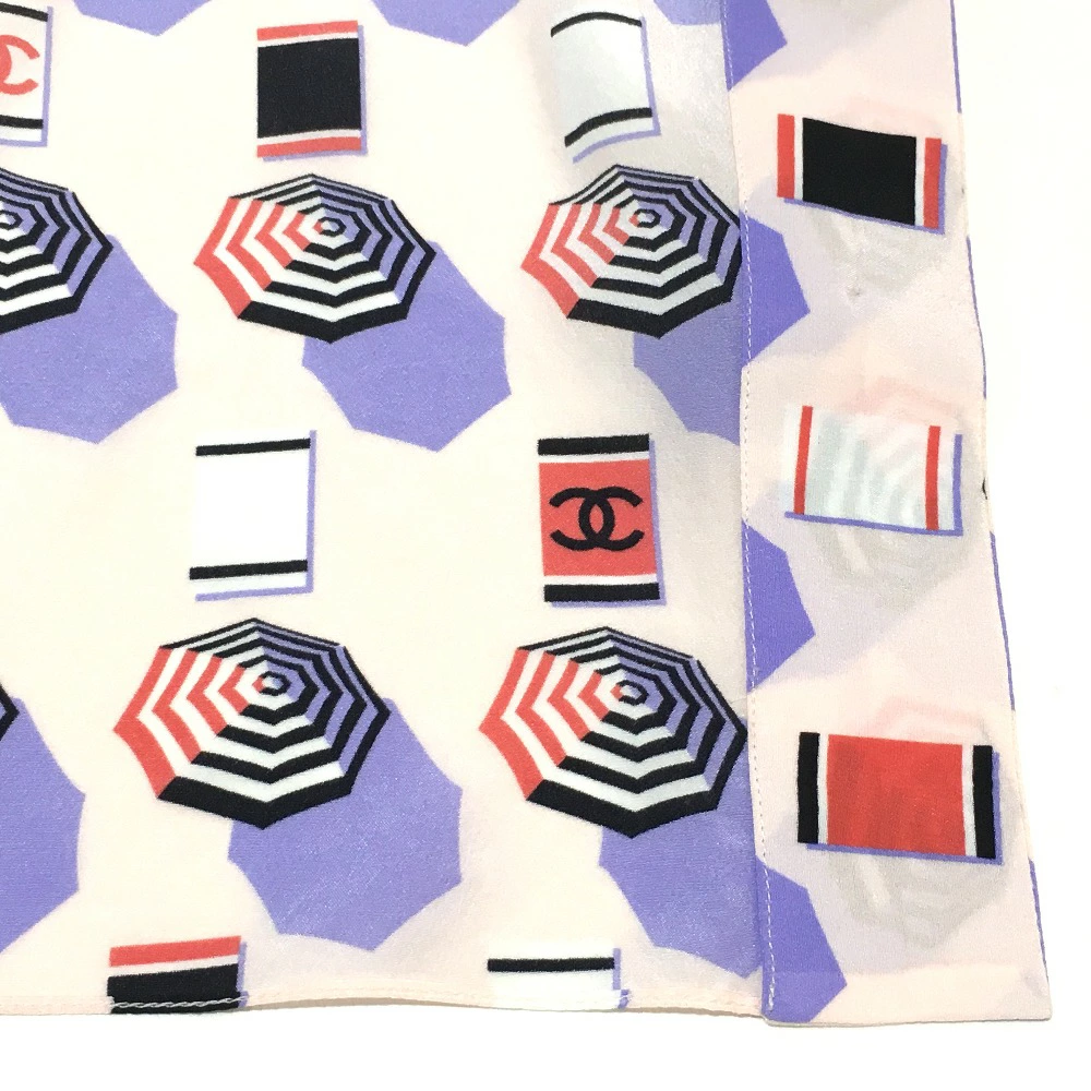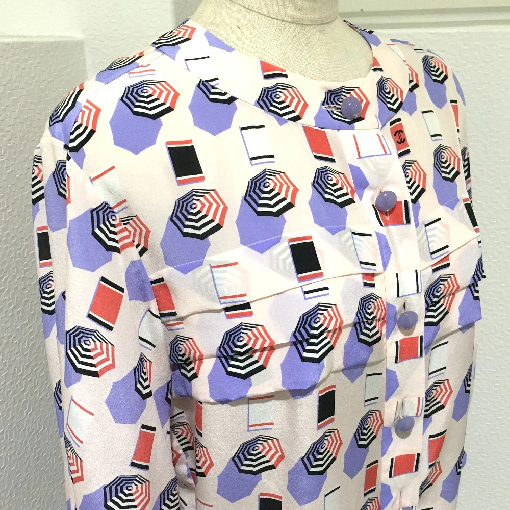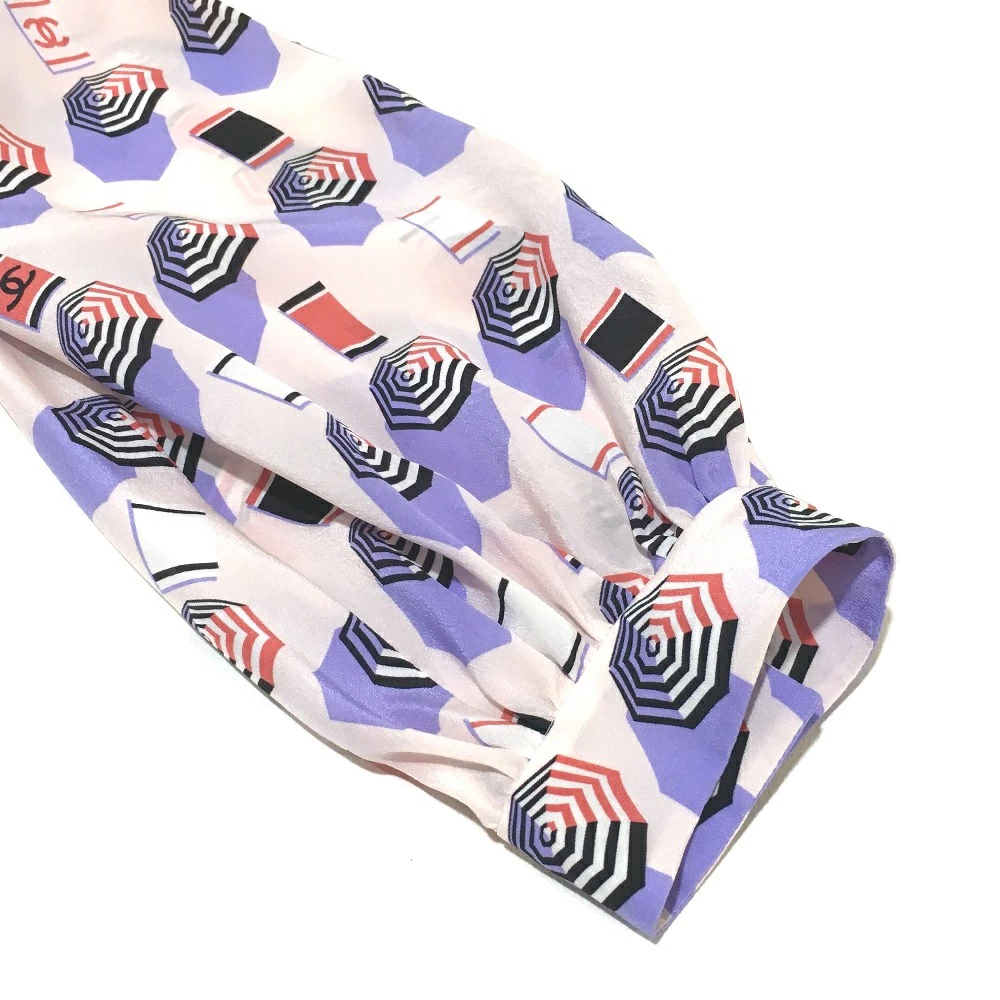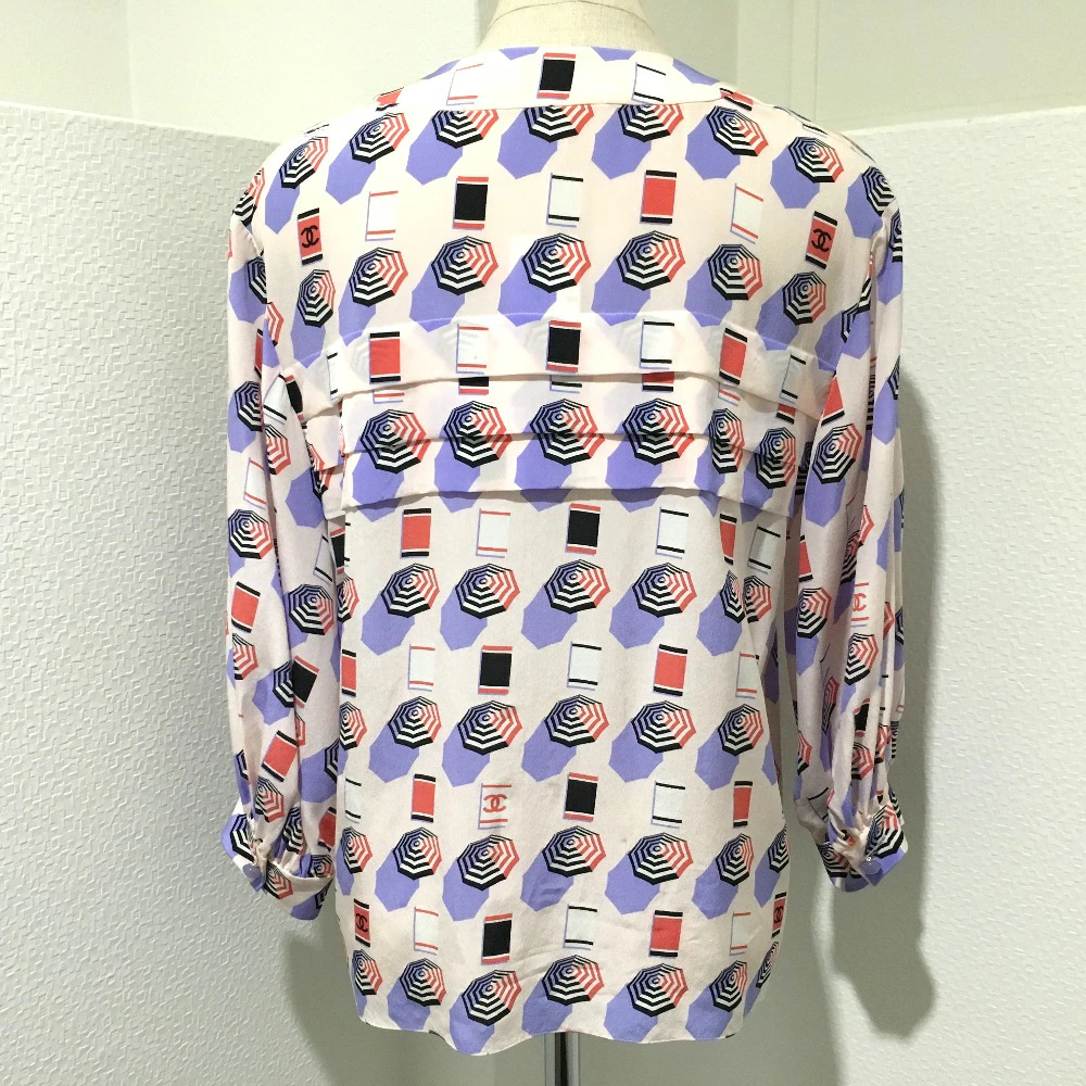 | 商品説明 | CHANELのノーカラーパラソルモチーフのブラウスです。100%シルク素材でサラリと着用して頂けます。少しボリュームのある袖口が女性らしい、可愛らしく上品な印象を与えます。パープルのボタンにも、さり気なくココマークが入っており細部までCHANELに包まれたアイテムです。 |
