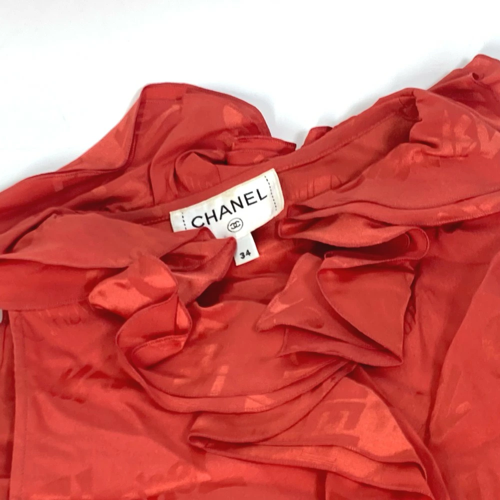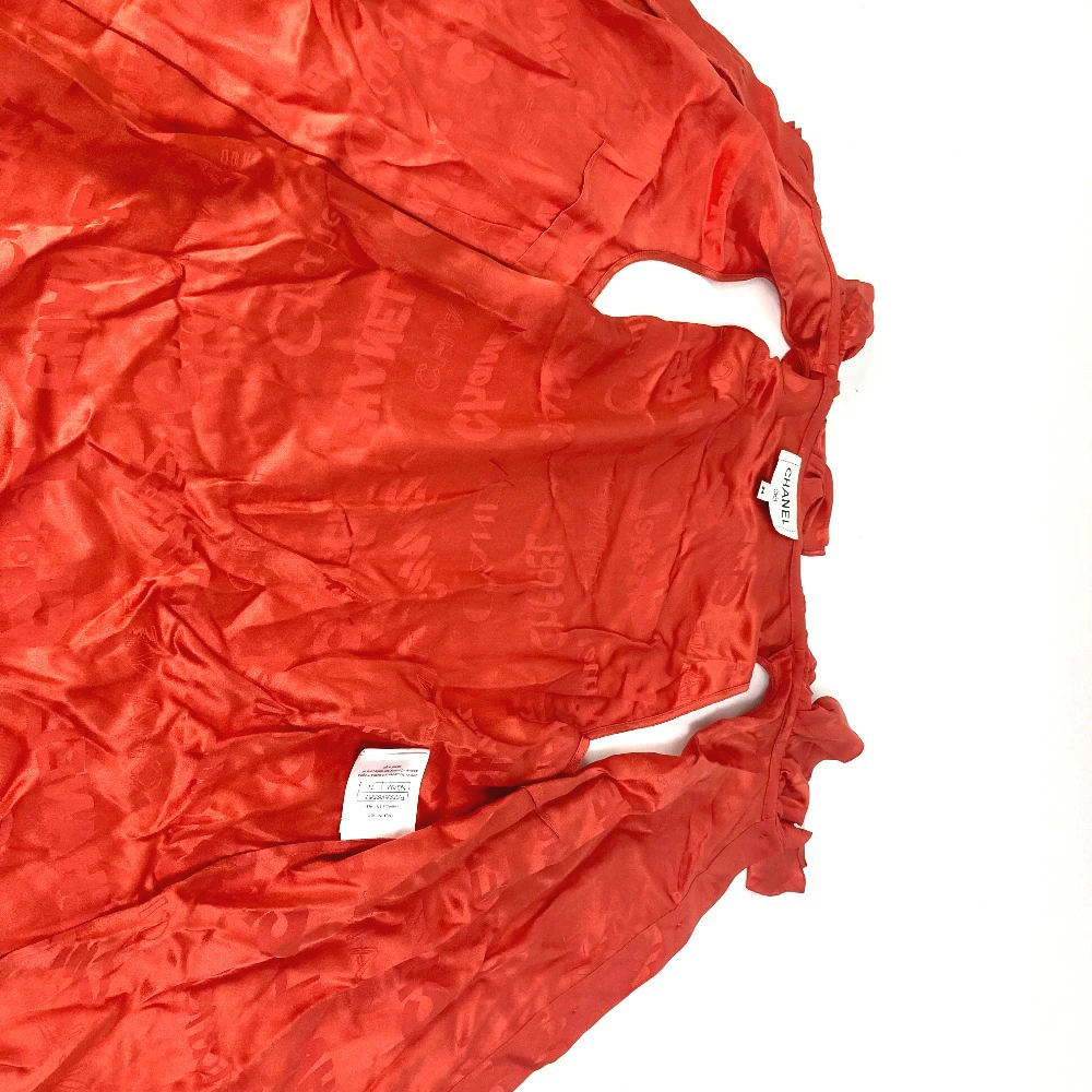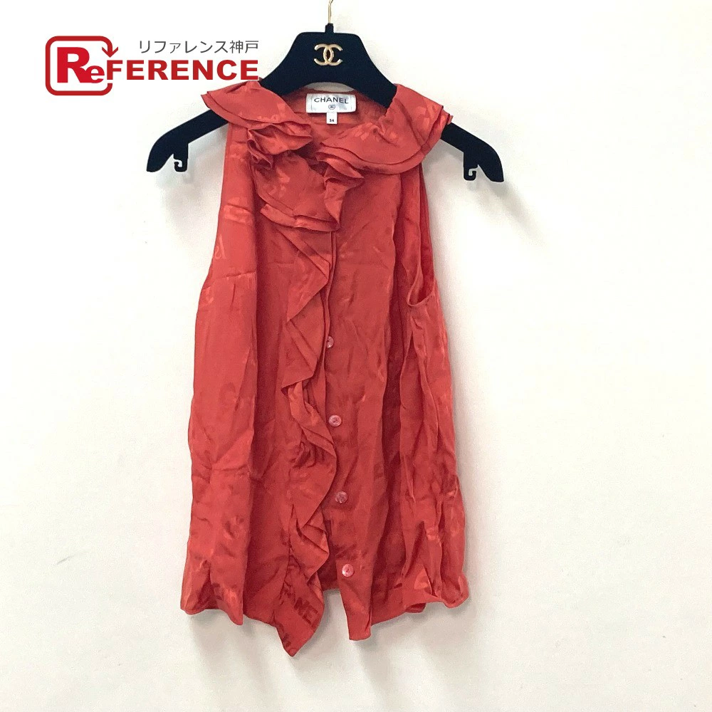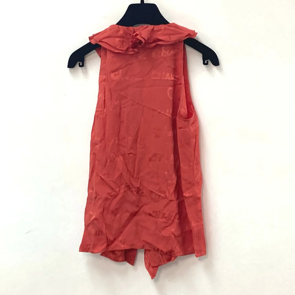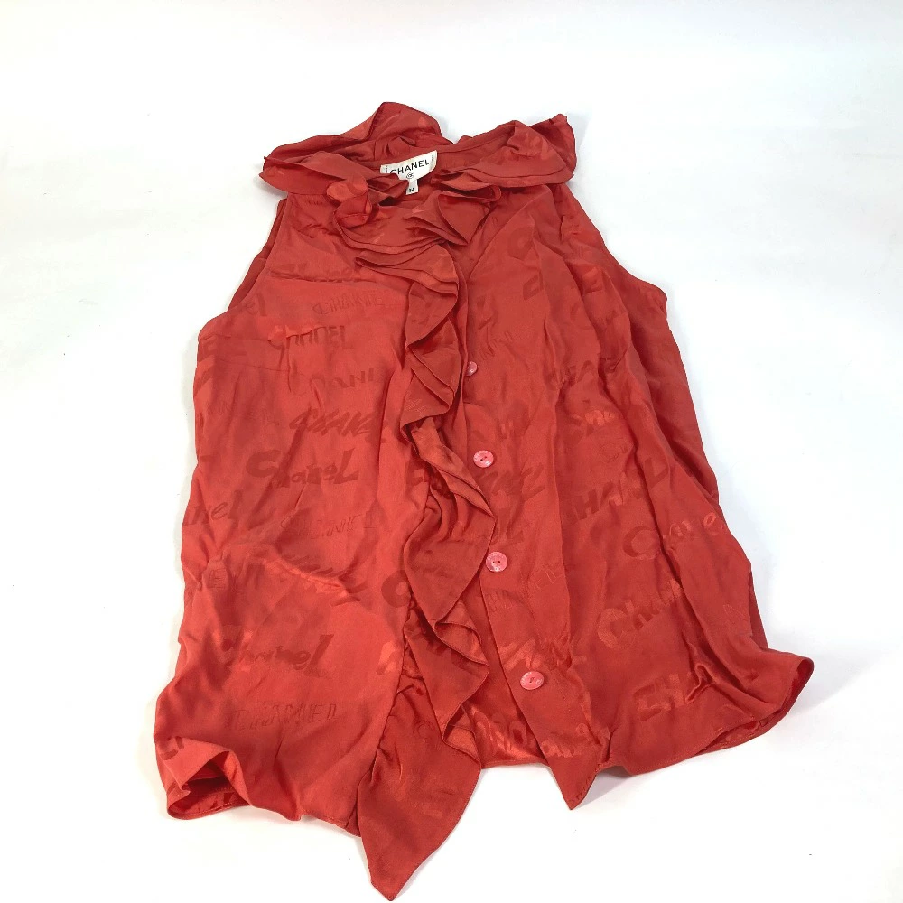 Pre-owned CHANEL P72306 logo all-over ruffle sleeveless top, size 22, silk, red, for women.
