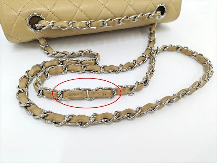チェーン部分に糸切れ等見られ、画像の通り、全体的に使用感のある中古Bランクの商品です。