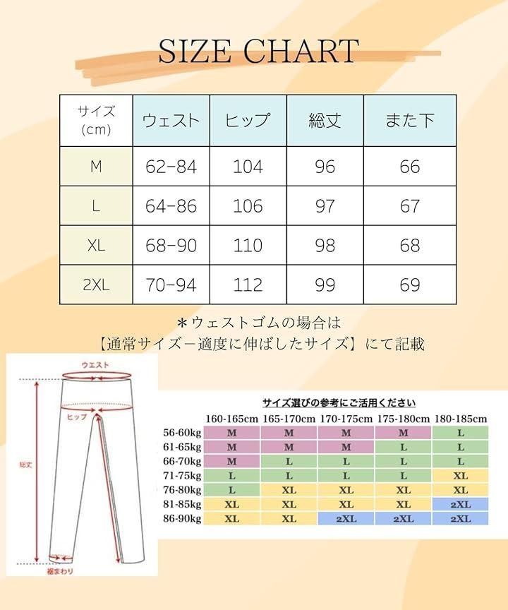 M:ウエスト62-84、ヒップ104、パンツ丈96、股下66 / L:ウエスト64-86、ヒップ106、パンツ丈97、股下67 / XL:ウエスト68-90、ヒップ110、パンツ丈98、股下68 / 2XL:ウエスト70-94、ヒップ112、パンツ丈99、股下69 *サイズは計測方法により2~3cmの誤差が生じる場合もございます。