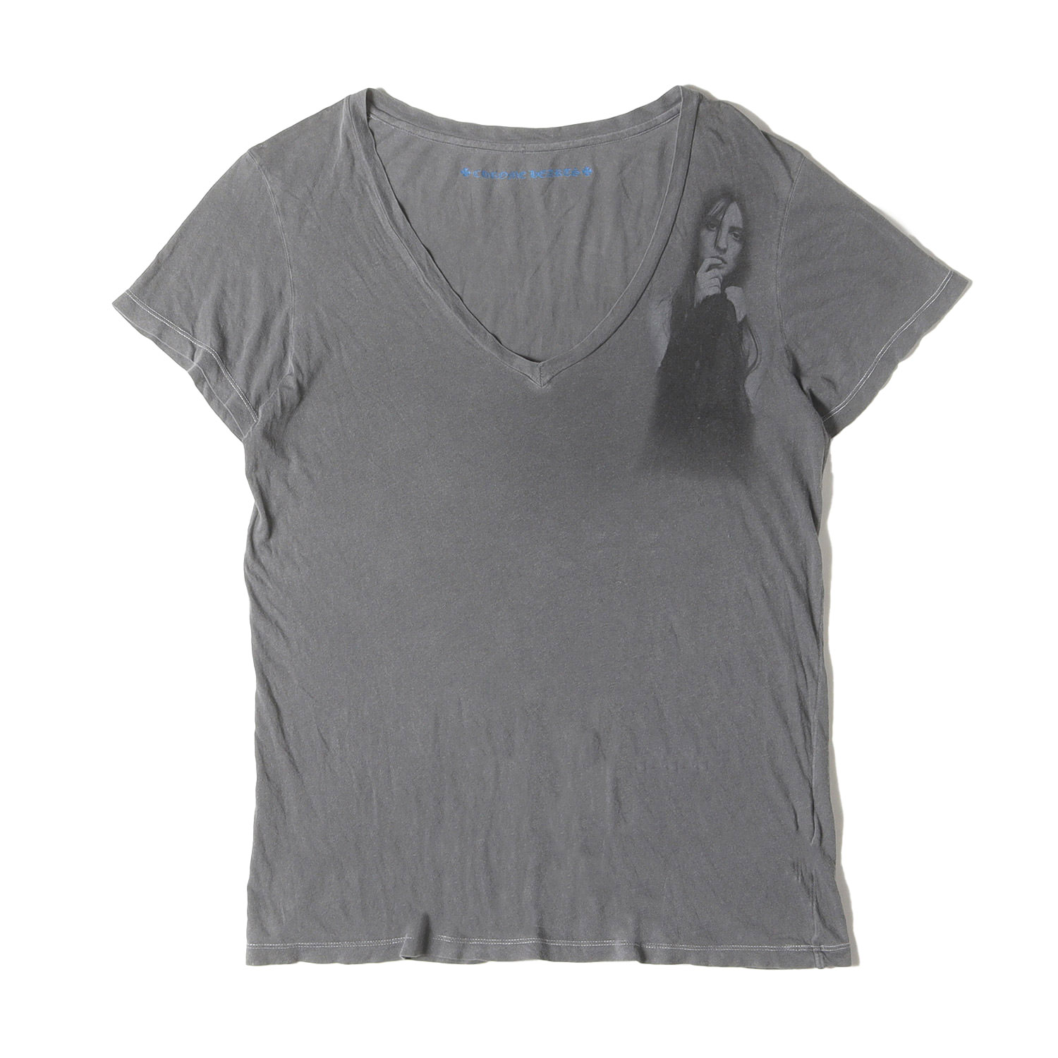 - レディーフォトプリントをあしらった珍しいデザインのVネックTシャツです。ボディには薄手でソフトなコットン生地を使用しております。