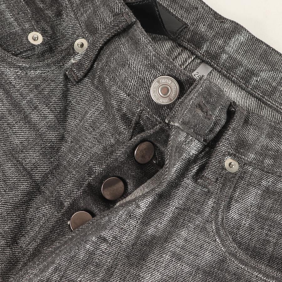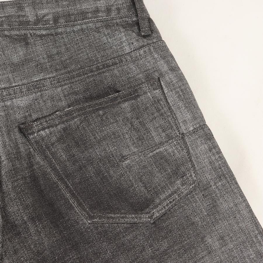 - こちらはアーカイブアイテムのボタンフライデニムパンツです。シルバーのコーティング加工を施し、スリムストレートシルエットで仕上げた一本になります。