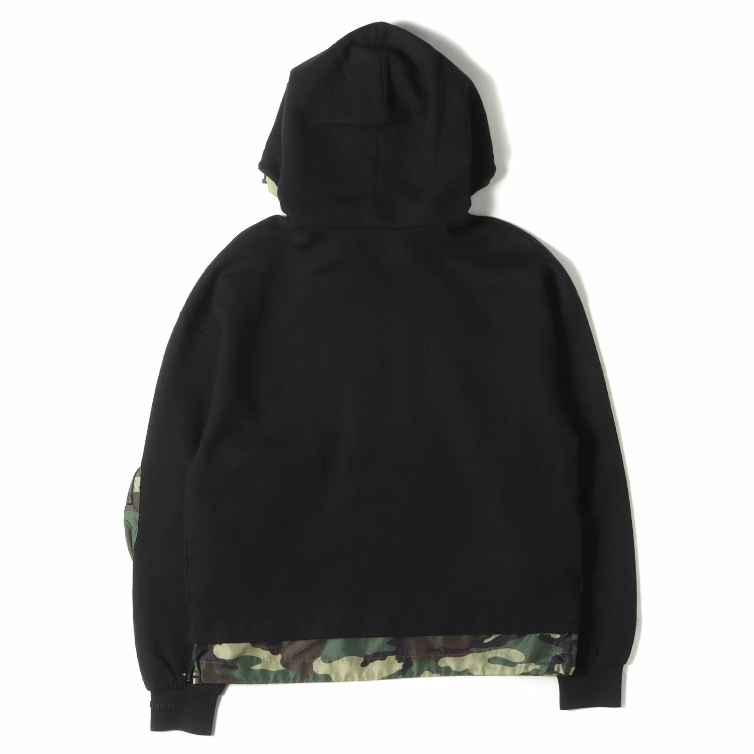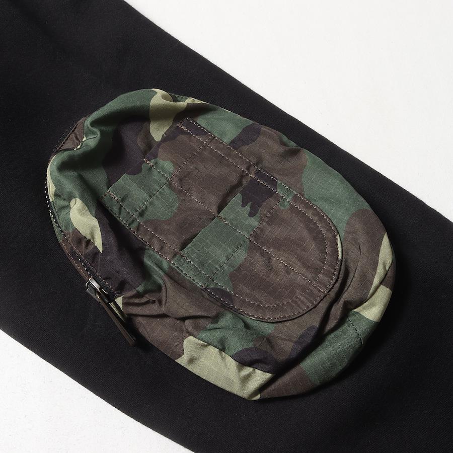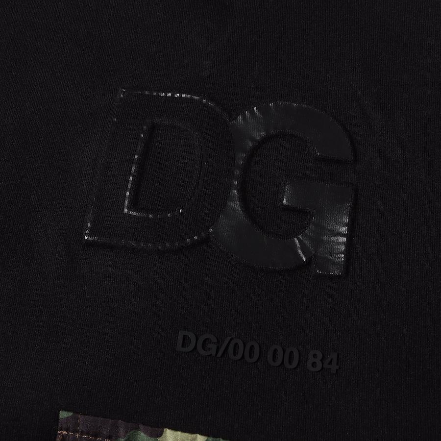 伸縮性のあるストレッチコットンポリエステル混紡テックスウェット地を使用し、ウッドランドカモがあしらわれたリップストップポリエステル素材切り替えデザインが施され、左胸にDGブランドロゴエンボス加工が配されたプルオーバーパーカーです。