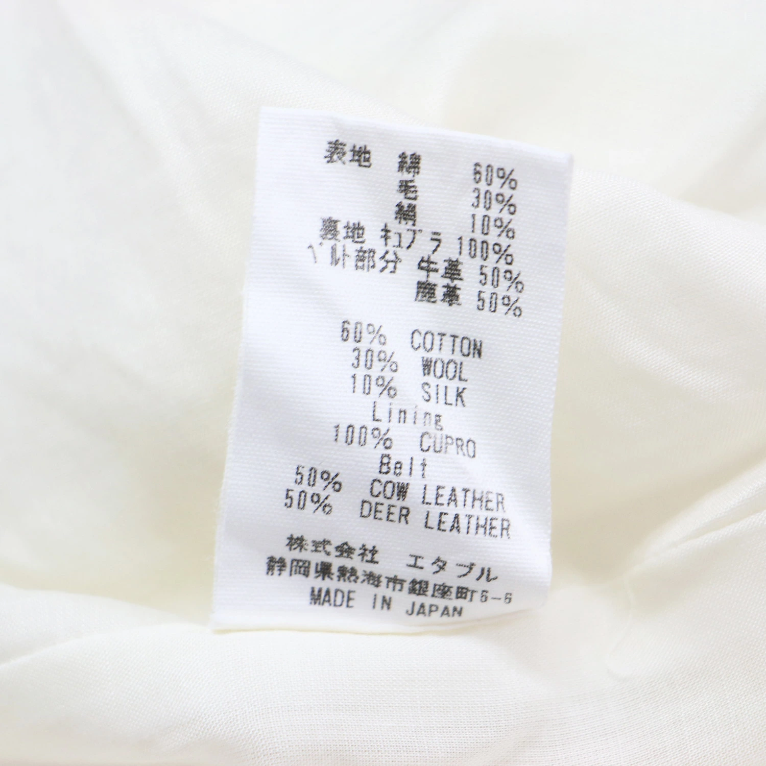 素材表地 コットン 60% ウール 30% シルク 10% 裏地 キュプラ 100% ベルト部分 牛革 50% 鹿側 50%