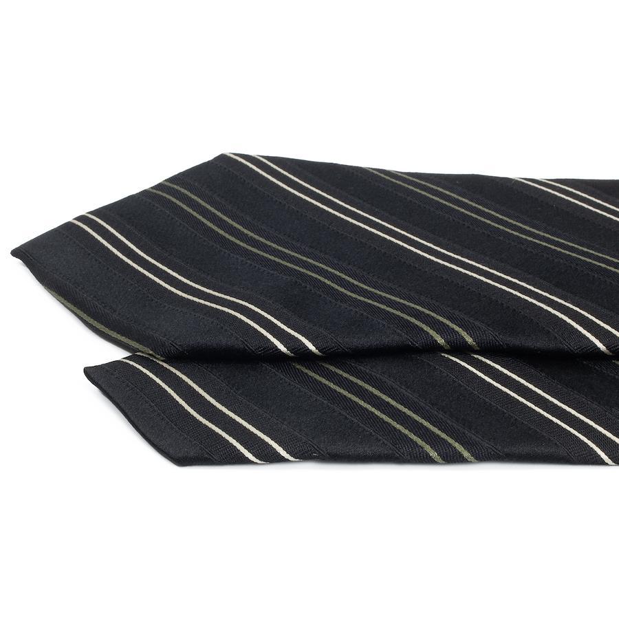 深いブラックの地に、シルバーとグレーグリーンが知的なストライプを描きます。