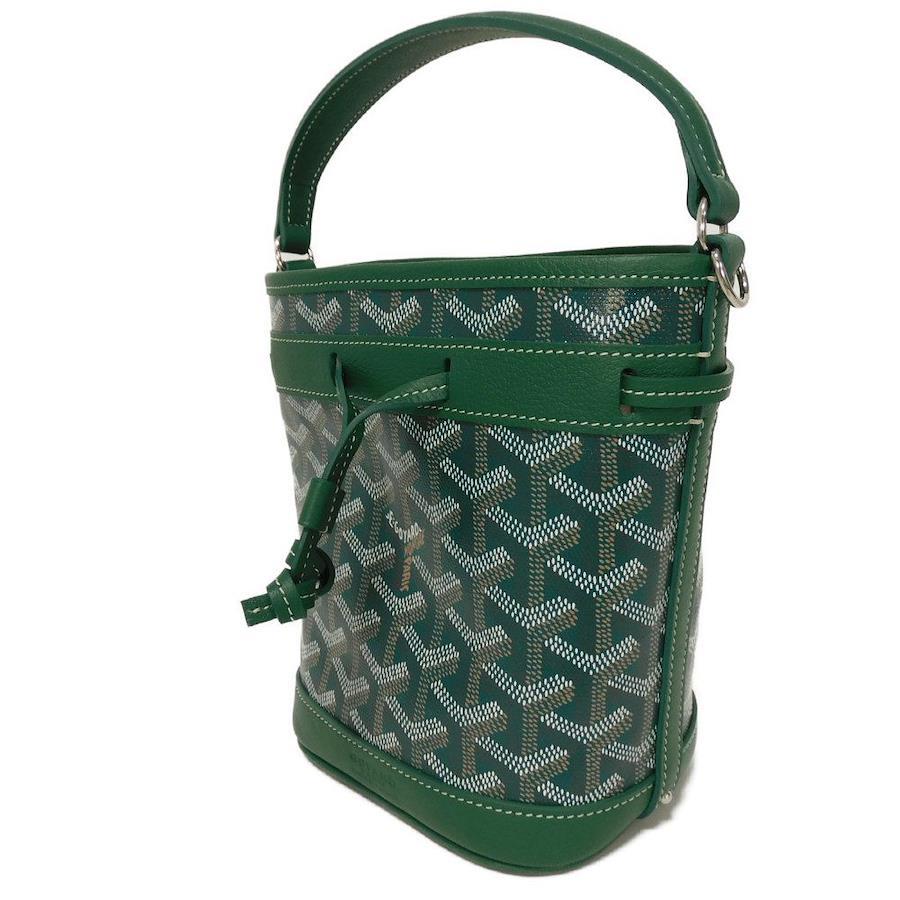 リネンとコットンのキャンバスにコーティングが施された、ヘリンボーン柄モチーフにゴヤールのロゴがあしらわれたバケットバッグです。