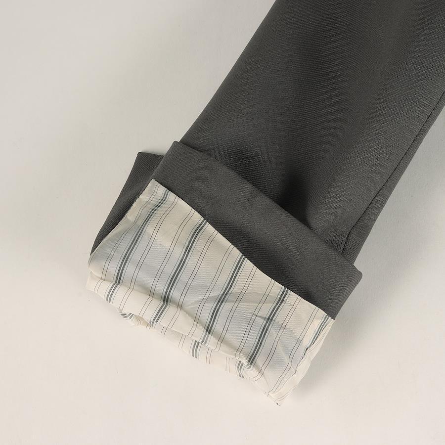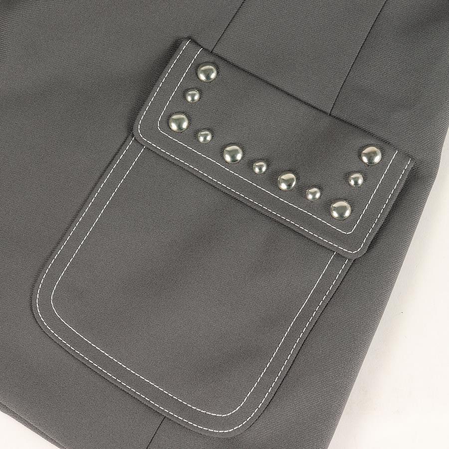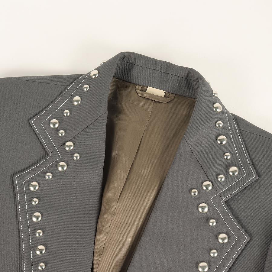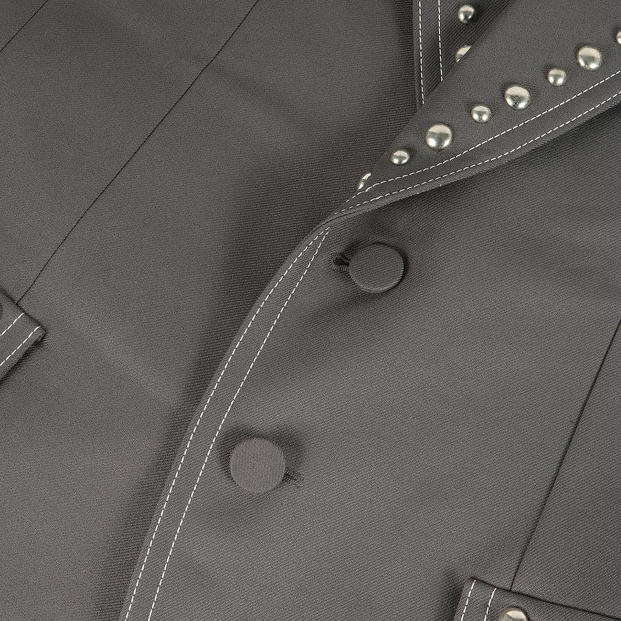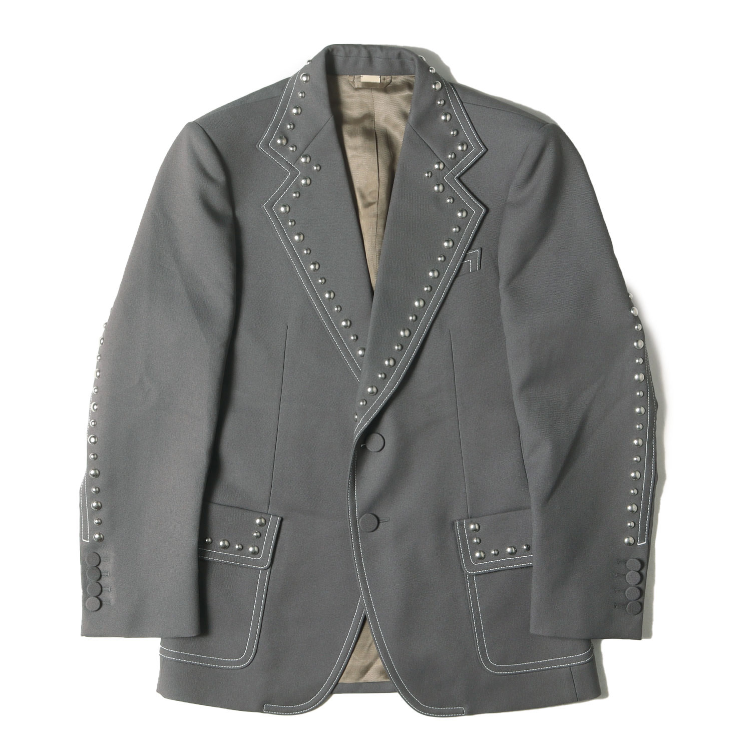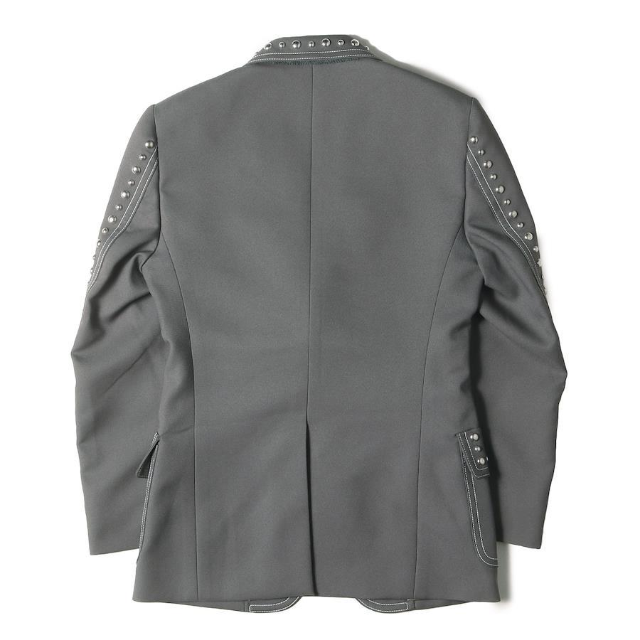 - ポリエステルツイル生地を使用し、2ボタンで仕上げたテーラードジャケットです。ラペルやポケット、袖にあしらったスタッズがポイントです。裏地は袖通りの良いレーヨン生地です。