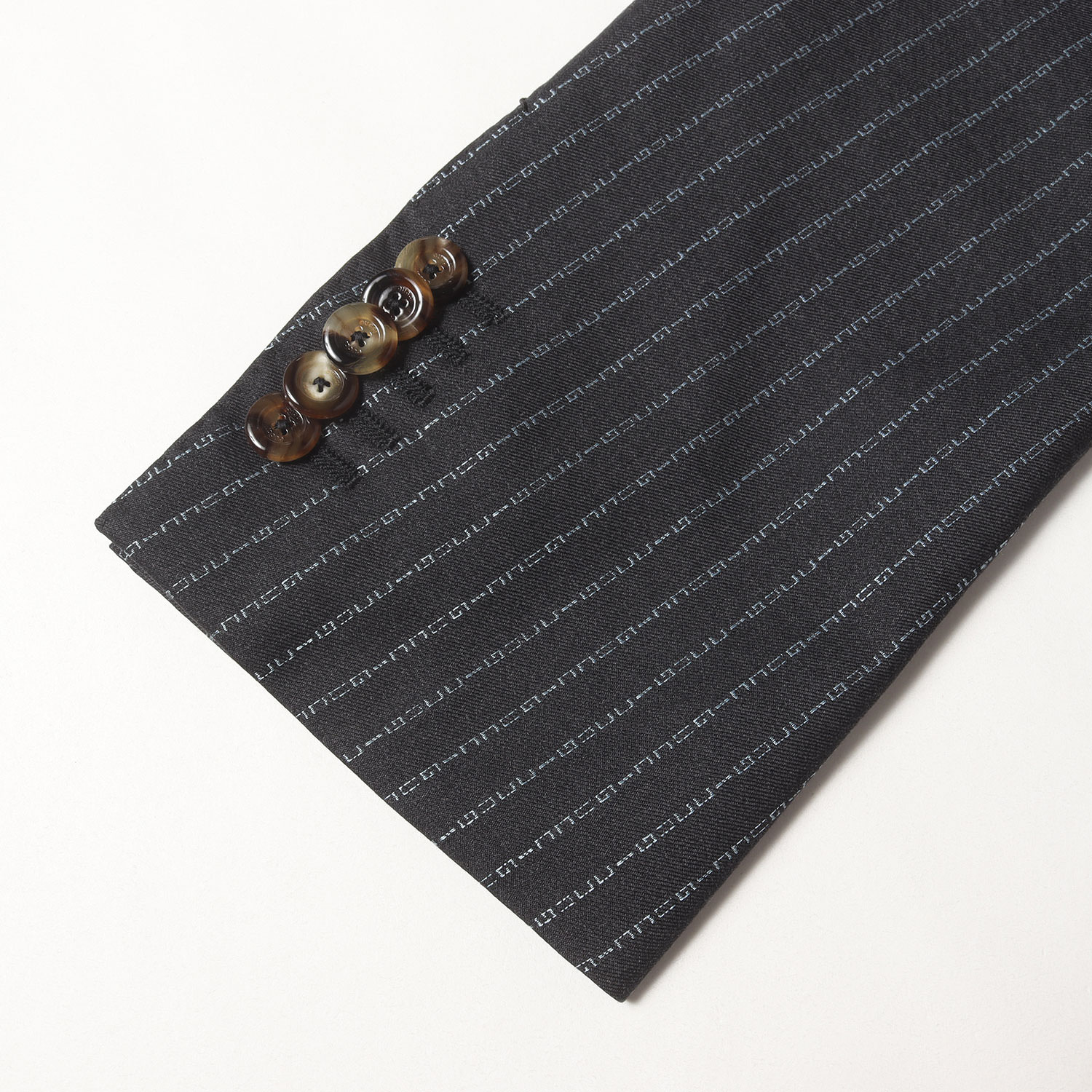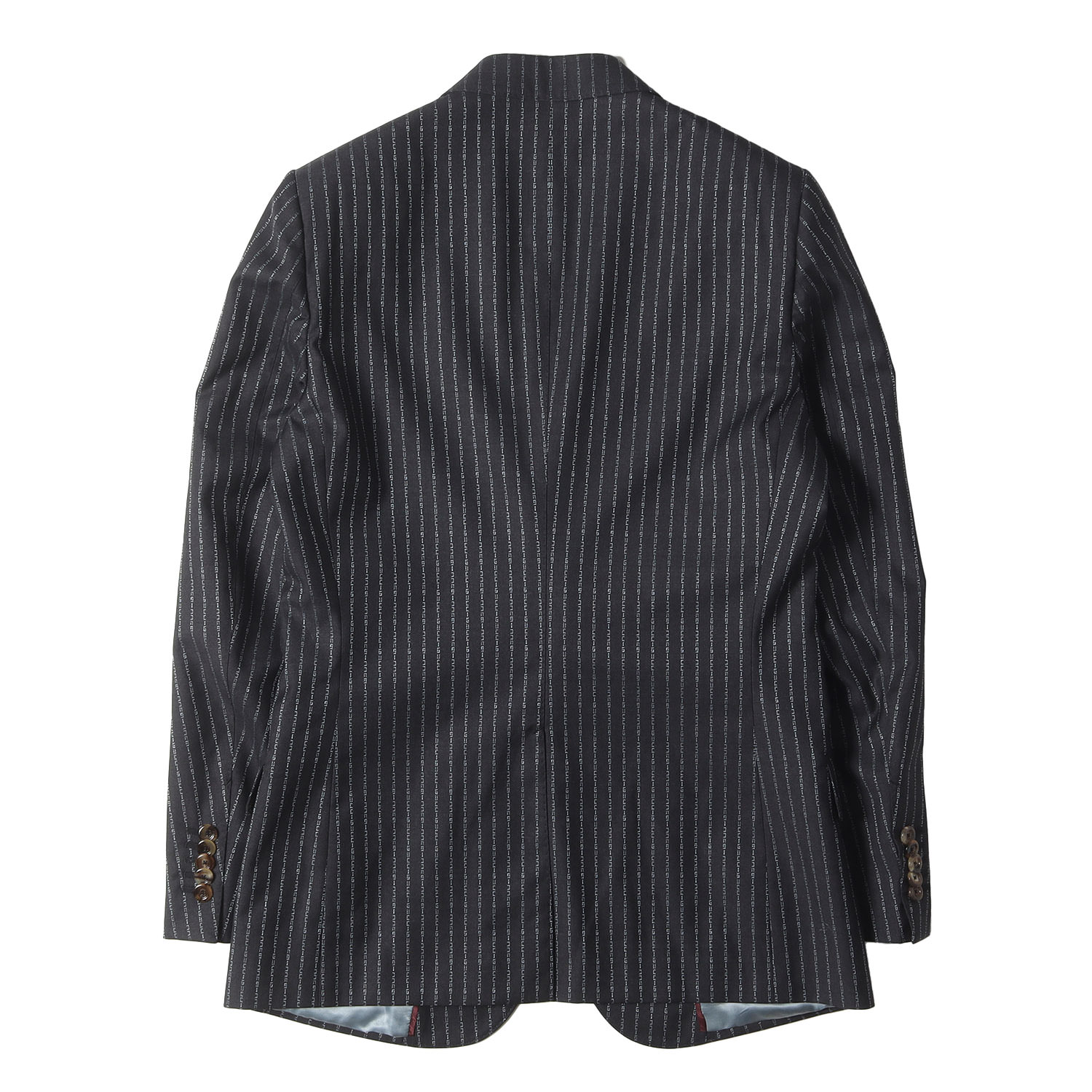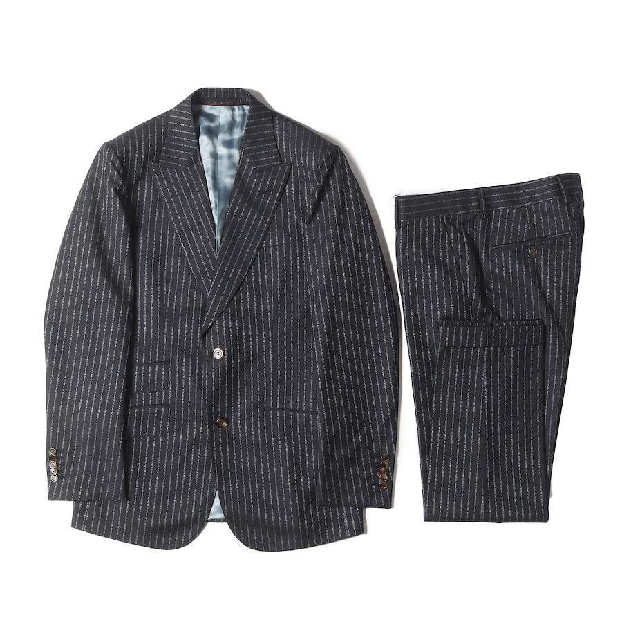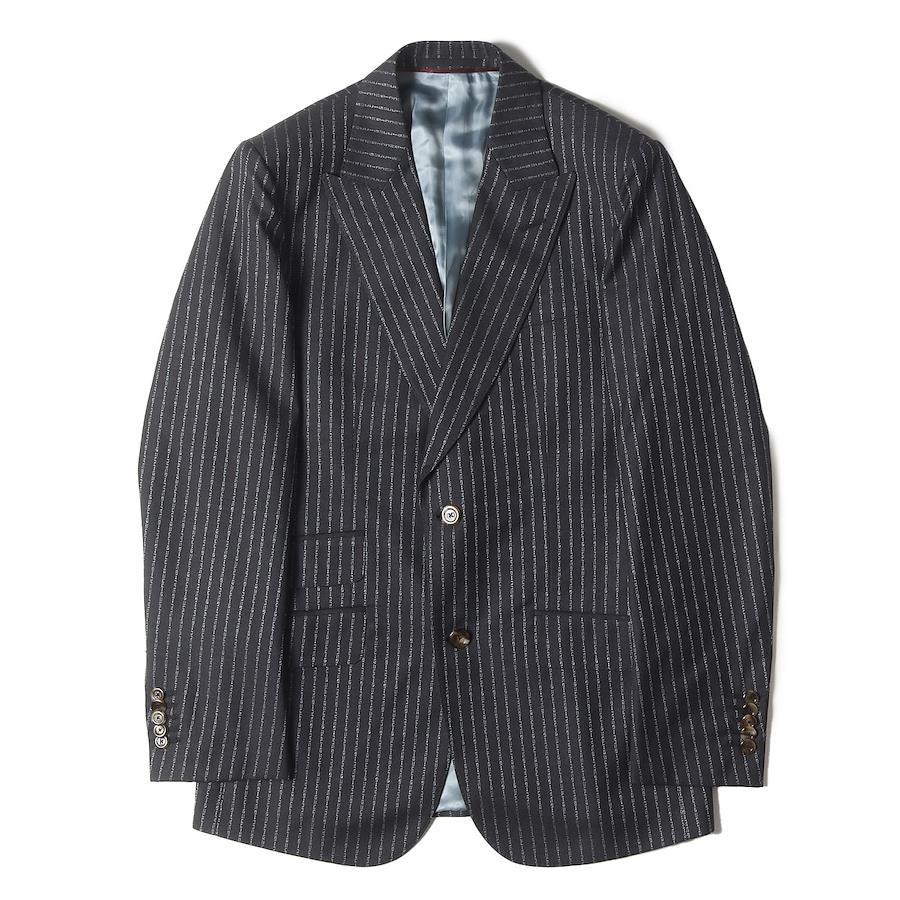 | 商品説明 | ジャケット ・表地 ウール生地 ・裏地 キュプラ生地 ・ブランドロゴを用いたストライプ柄 ・ピークドラペル ・センターベント ・仮切羽