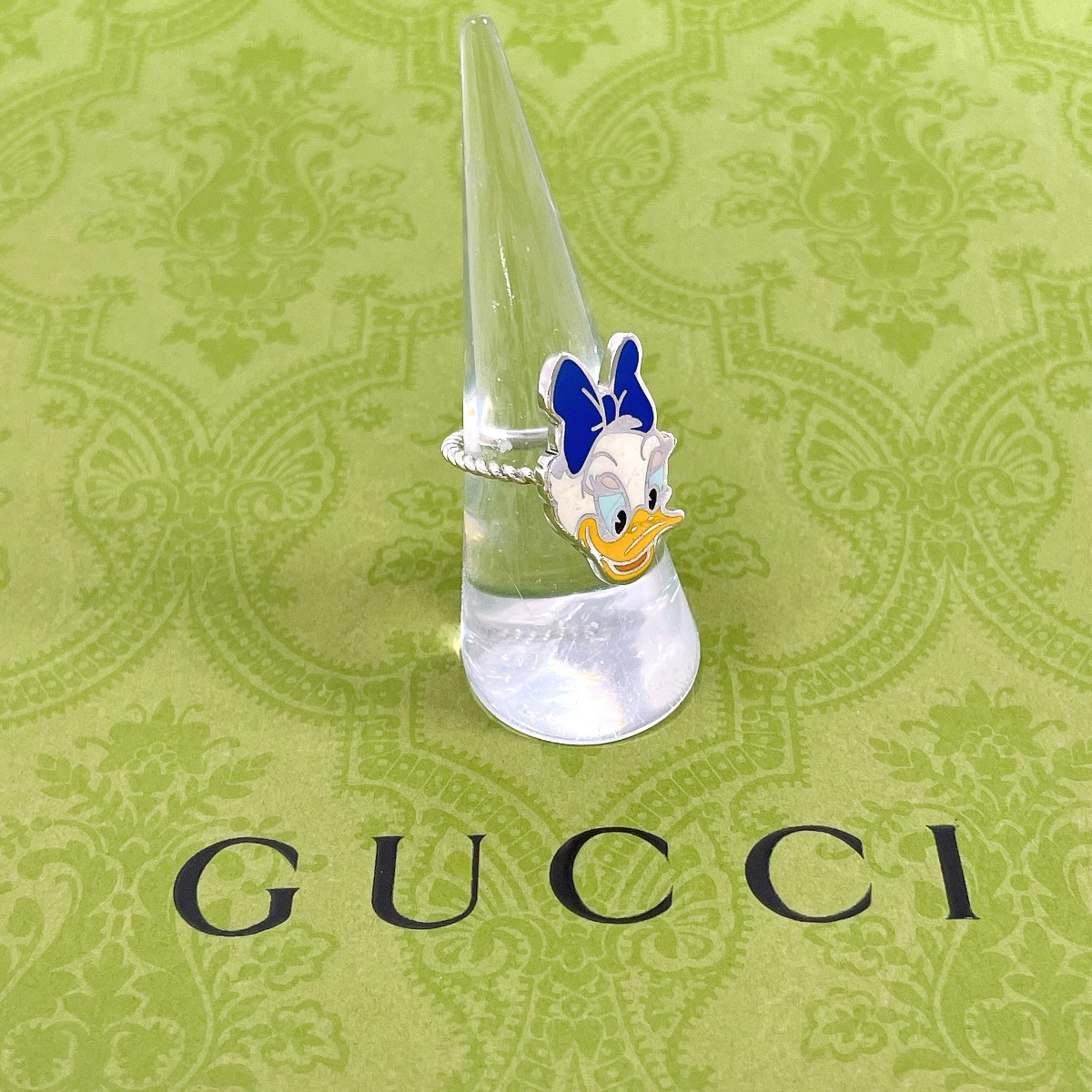 | 商品説明 | GUCCIとDisneyコラボのデイジーダックモチーフのリング。愛らしい表情とブルーのリボンが印象的です。ポップで華やかなデザインが指元のアクセントとして存在感を放ちます。 |