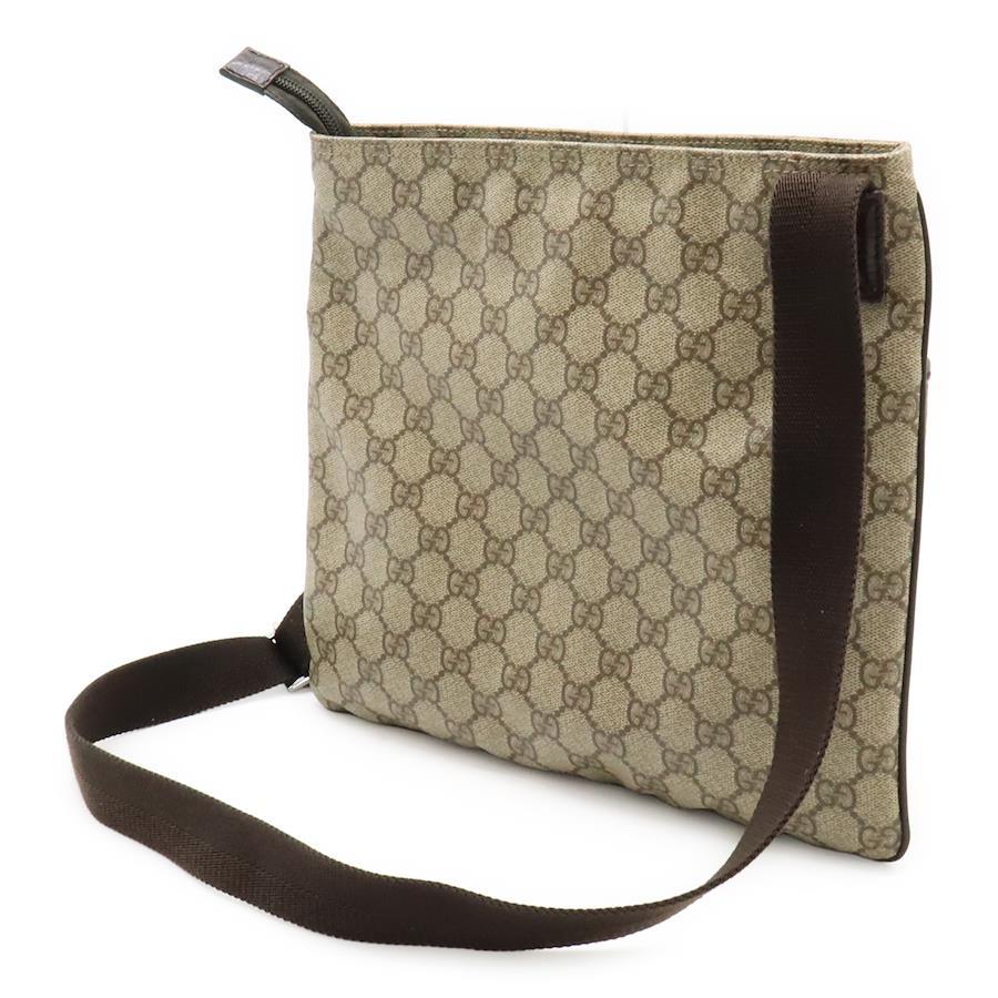 【商品説明】[サイズ]W29cm H26.5cm ショルダー最長120cm(調節可、金具含む)[材質]GGスプリーム キャンバス(PVCコーティング)/レザー[カラー]ベージュ/ダークブラウン[仕様]外側ポケット1、内側ファスナーポケット1[付属品]保存袋[重さ]約380g