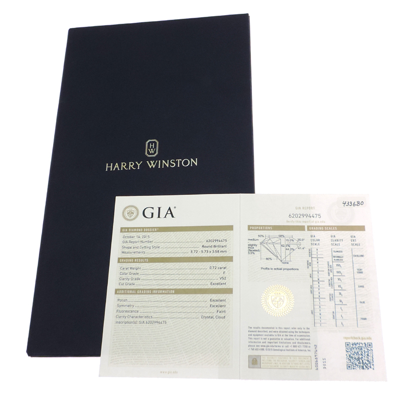 Outer box: ScratchesInner box: Slight scratches Weight: 3.6gStone type: Diamond 0.72ctFinished at our partner workshop* Due to changes in Harry Winston's regulations, repairs by the manufacturer are not accepted.Clarity: VS2Color: FPolishness: EXCELLENTSymmetry: EXCELLENTFluorescence: NONEDiamond shape: Round brilliant cutOverall cut evaluation: EXCELLENTThe actual color of the product may differ from what you see on your screen or display.