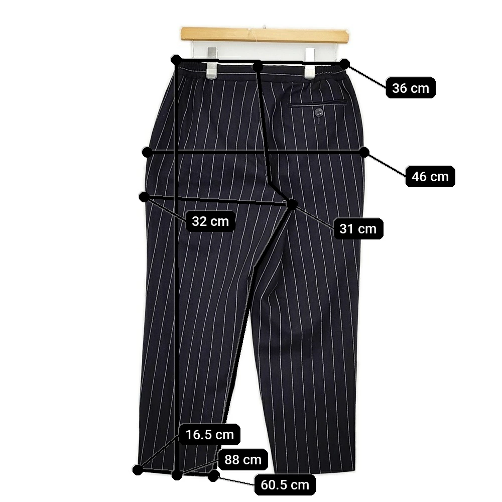 | 実寸サイズ | 総丈:約88cm ウエスト:約36cm ウエスト最長:約43cm 股上:約31cm 股下:約60.5cm ヒップ:約46cm ワタリ幅:約32cm 裾幅:約16.5cm 備考 品質タグに記載はありませんがフロント脚部に裏地が付いています。 ※採寸画像がある商品はハンガーに吊るした状態での計測のため、平置きでの採寸とは差が生じる場合がございます。平置きでの実寸サイズをご希望の場合は、ご購入前に必ずご質問ください。 ※記載以外のサイズが合わないことを理由とした返品はできませんので、 記載部分以外で実寸サイズの気になる箇所があれば必ず購入前にご質問ください。 |