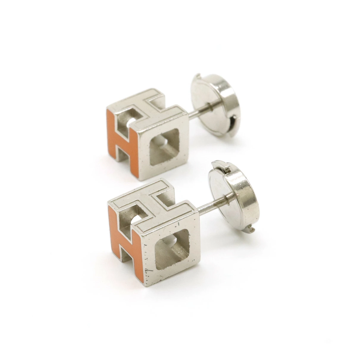 Pre-owned HERMES Carage d'Ache H Cube H Logo Earrings in Orange with Silver Hardware