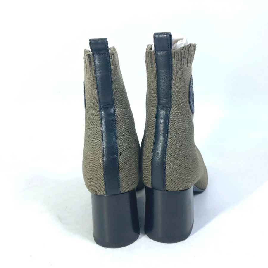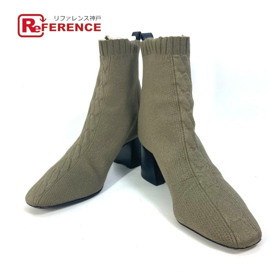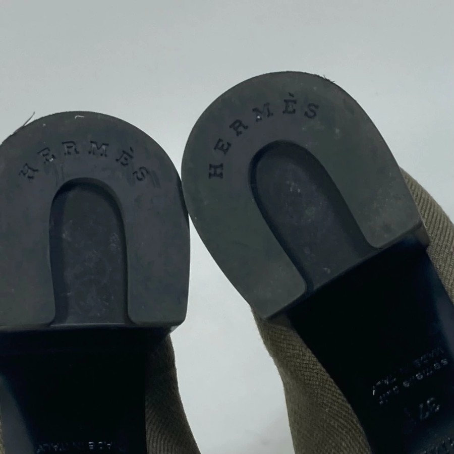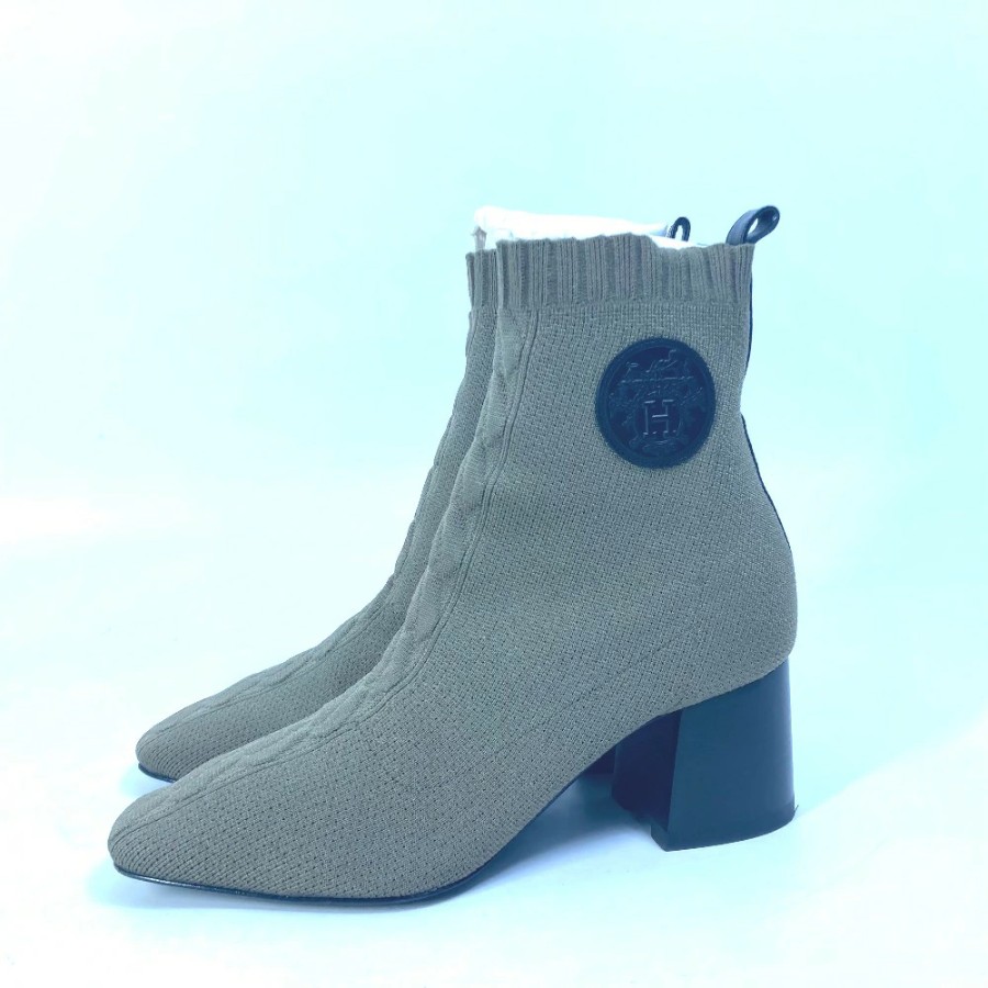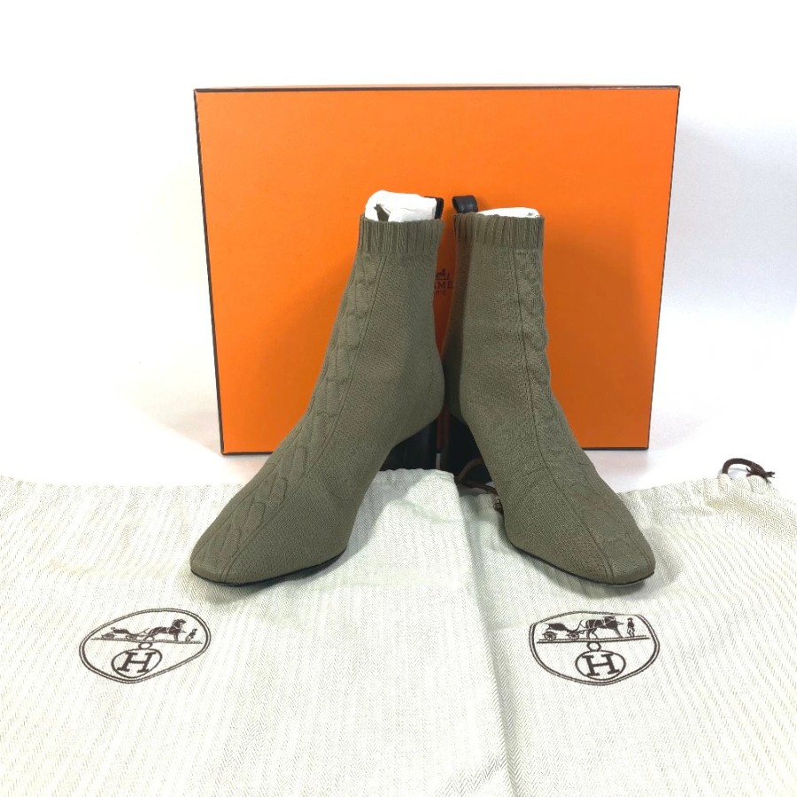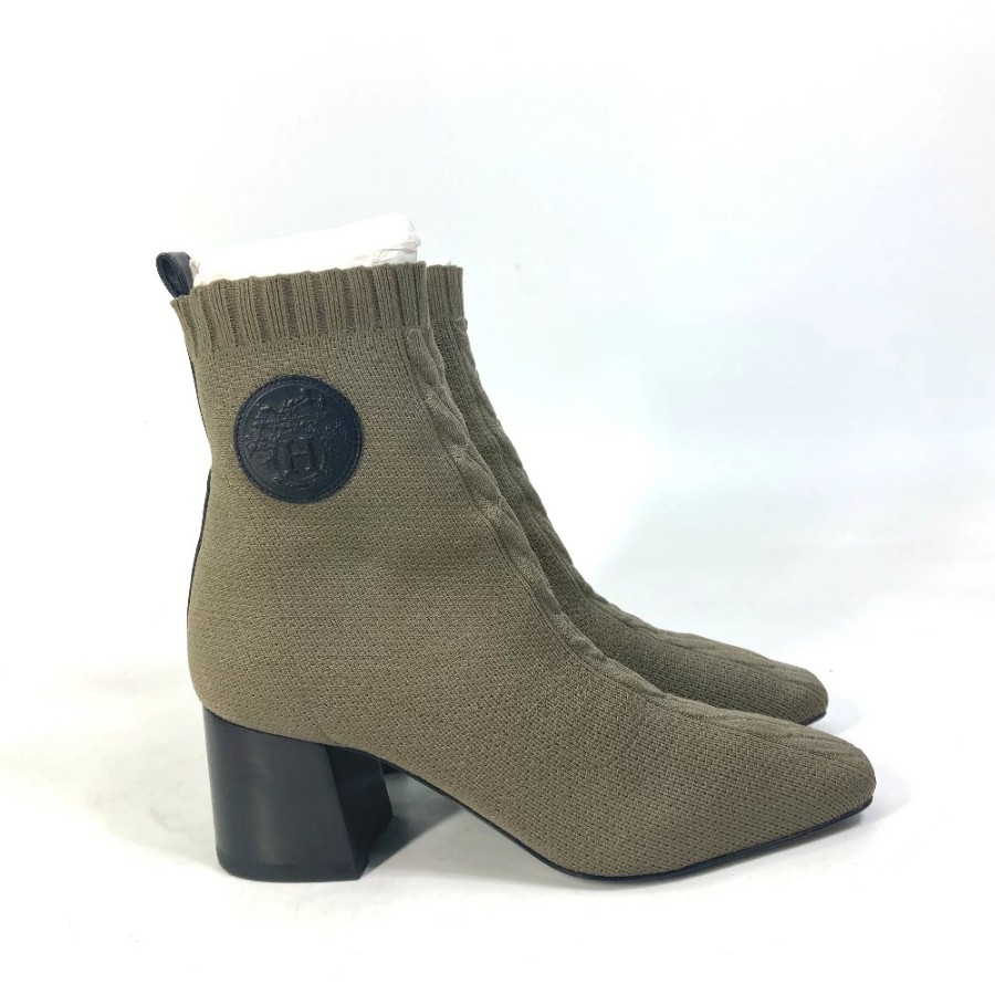 HERMES Volvert Short Boots, Size 60, with H-logo, Knit/Leather, Women's, Khaki [Used]